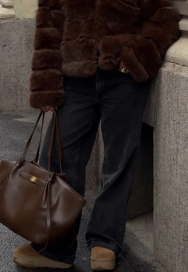 Abrigo de pelo corto confeccionado en suave tejido sintético, con cuello alto forrado para mayor calidez. Presenta cierre cubierto y bolsillos verticales en la parte delantera. Su corte recto y regular fit lo convierten en una prenda cómoda y elegante, ideal para los días más fríos.