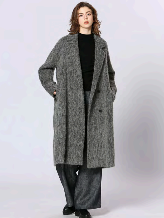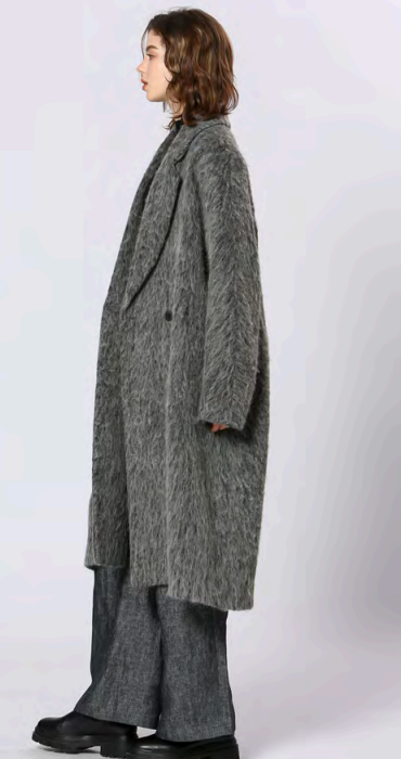 Abrigo largo de corte relajado confeccionado en mezcla de lana y alpaca. Su textura suave y ligeramente esponjosa aporta calidez y un aire sofisticado. Presenta solapas clásicas, cierre cruzado con botones y bolsillos laterales. Ideal para looks de invierno elegantes y cómodos.
