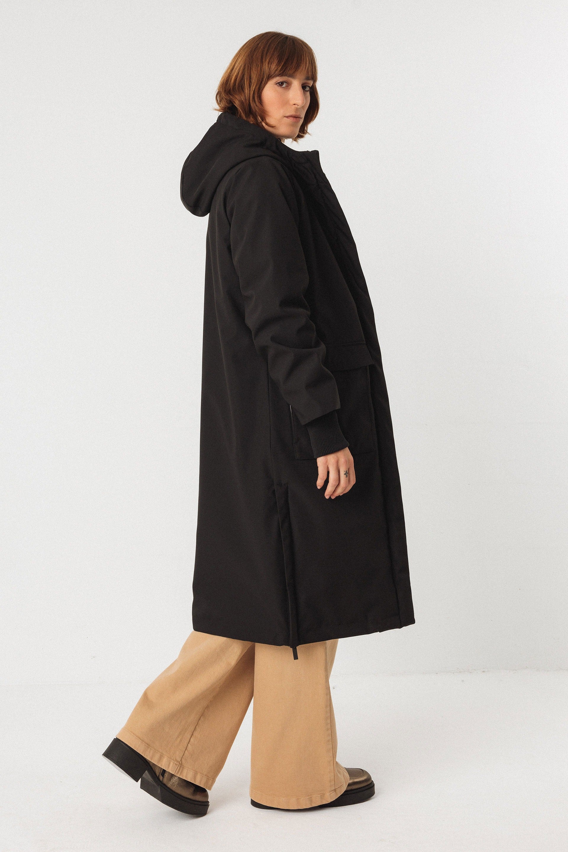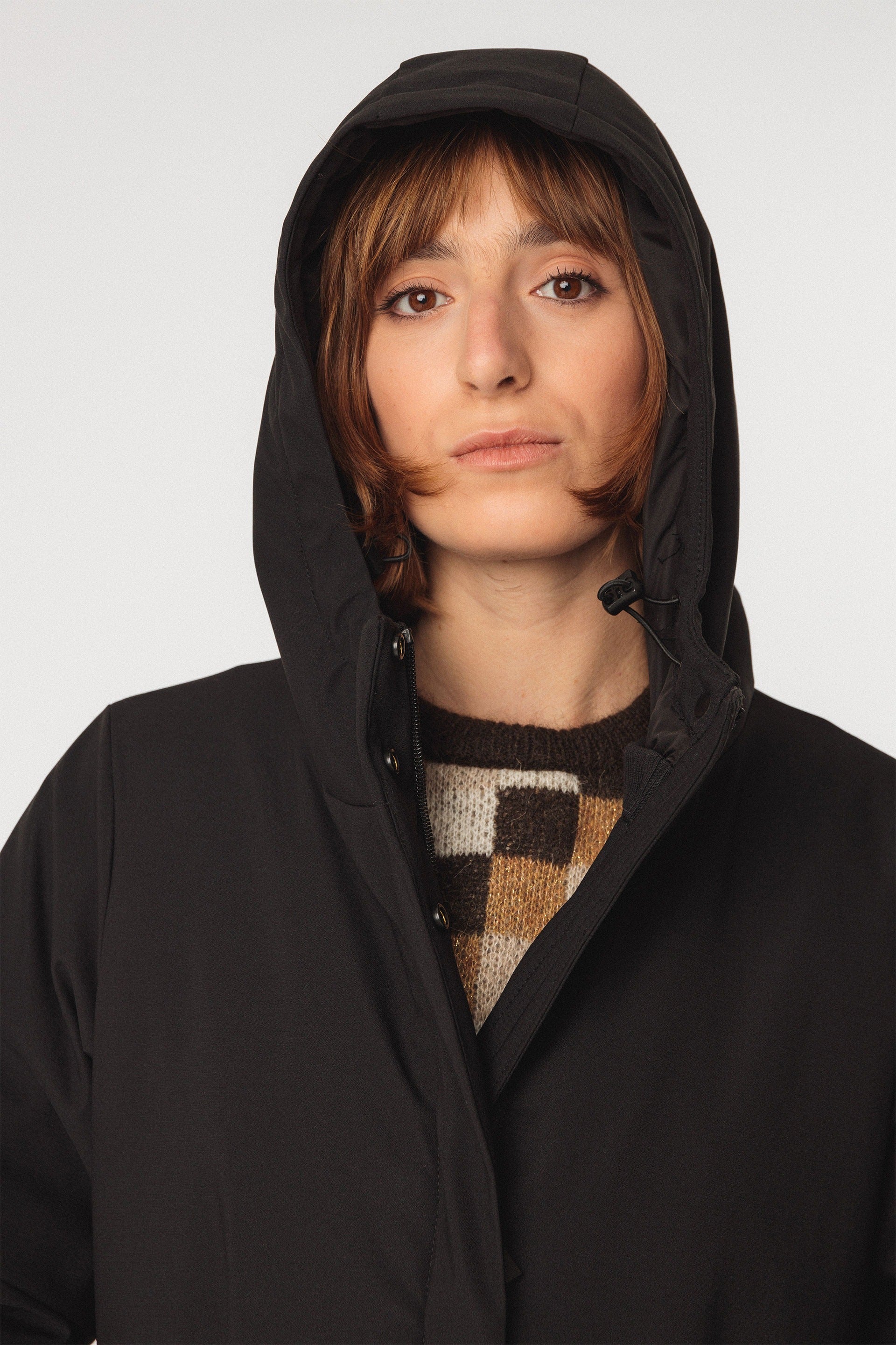 Abrigo con capucha, cierre delantero de cremallera y aberturas laterales con cremallera. Es hidrófugo, lleva un relleno aislante de abrigo Dupont Sorona y tiene los remates de los puños de canalé.