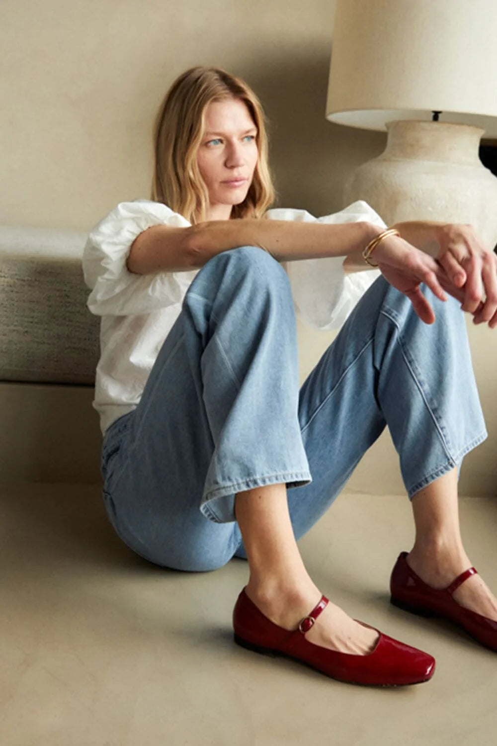 Preciosas bailarinas confeccionadas en charol rojo oscuro con puntera ligeramente cuadrada y una tira fina de piel con cierre de hebilla. El tacón bajo mide 12 mm.