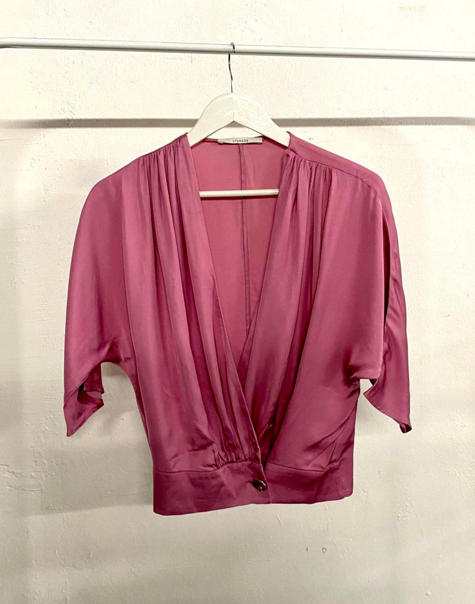 Blusa de nuestra selección de 2ª mano "Second Chance". Blusa rosa de Uterqüe. Talla S. Con botón dorado. Como nuevo usado una vez. De tacto sedoso. Manga 3/4.