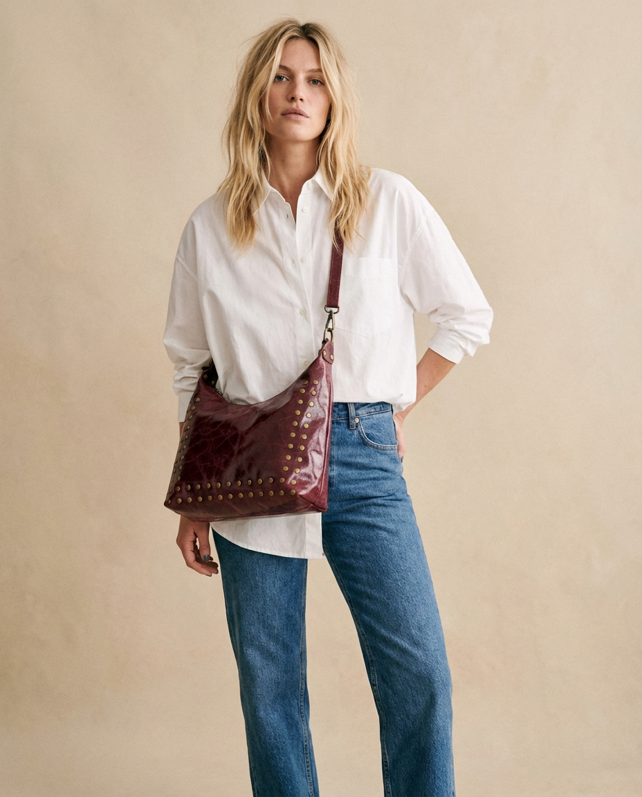 Bolso con tachuelas elaborado en piel efecto brillo, con cierre superior de cremallera y herrajes metálicos. El interior está completamente forrado e incorpora un bolsillo adicional con cremallera. Incluye un asa de mano y otra asa extensible para llevar al hombro o cruzado, ambas en el mismo material.