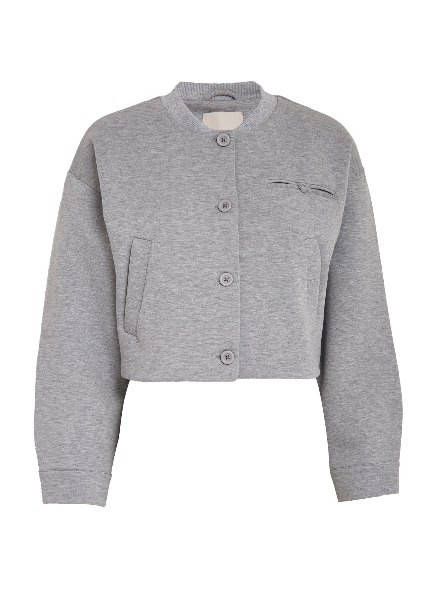 Bonita y funcional, así es esta chaqueta tipo bomber de color gris jaspeado.