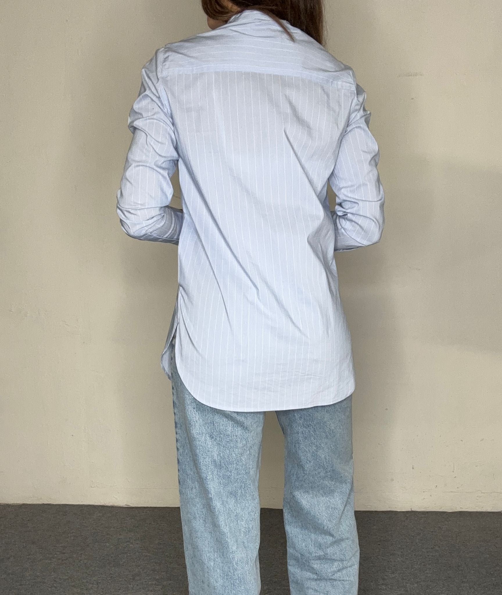 Camisa azul clásica con finas rayas verticales de ZARA, un básico atemporal que combina elegancia y frescura. Ideal para looks casuales o más formales.