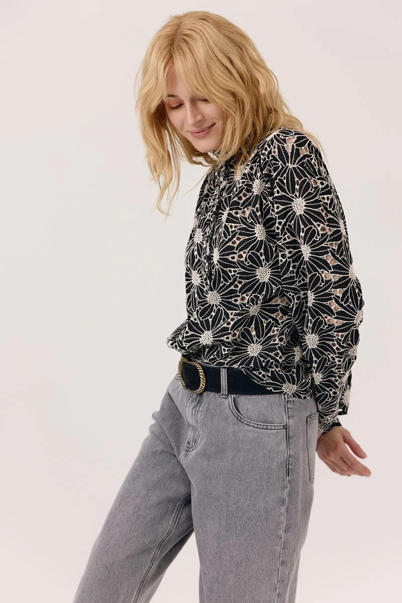 Camisa negra con bordado floral en contraste. Una prenda con personalidad y carácter.