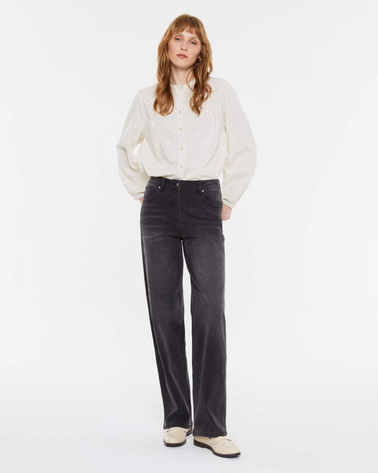 Camisa estampada de rayas, cuello mao y manga larga. Cierre frontal con botones. Detalle de cinta vainica en parte delantera. Regular fit.