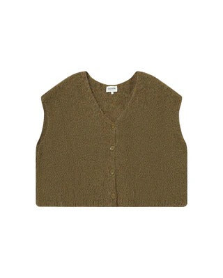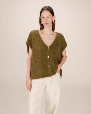 Cárdigan sin mangas tejido en una mezcla de alpaca y lana. Su corte holgado y escote en V favorecen a todo tipo de siluetas y realzan las curvas femeninas. La parte delantera abotonada le da un toque clásico a esta prenda moderna y versátil.