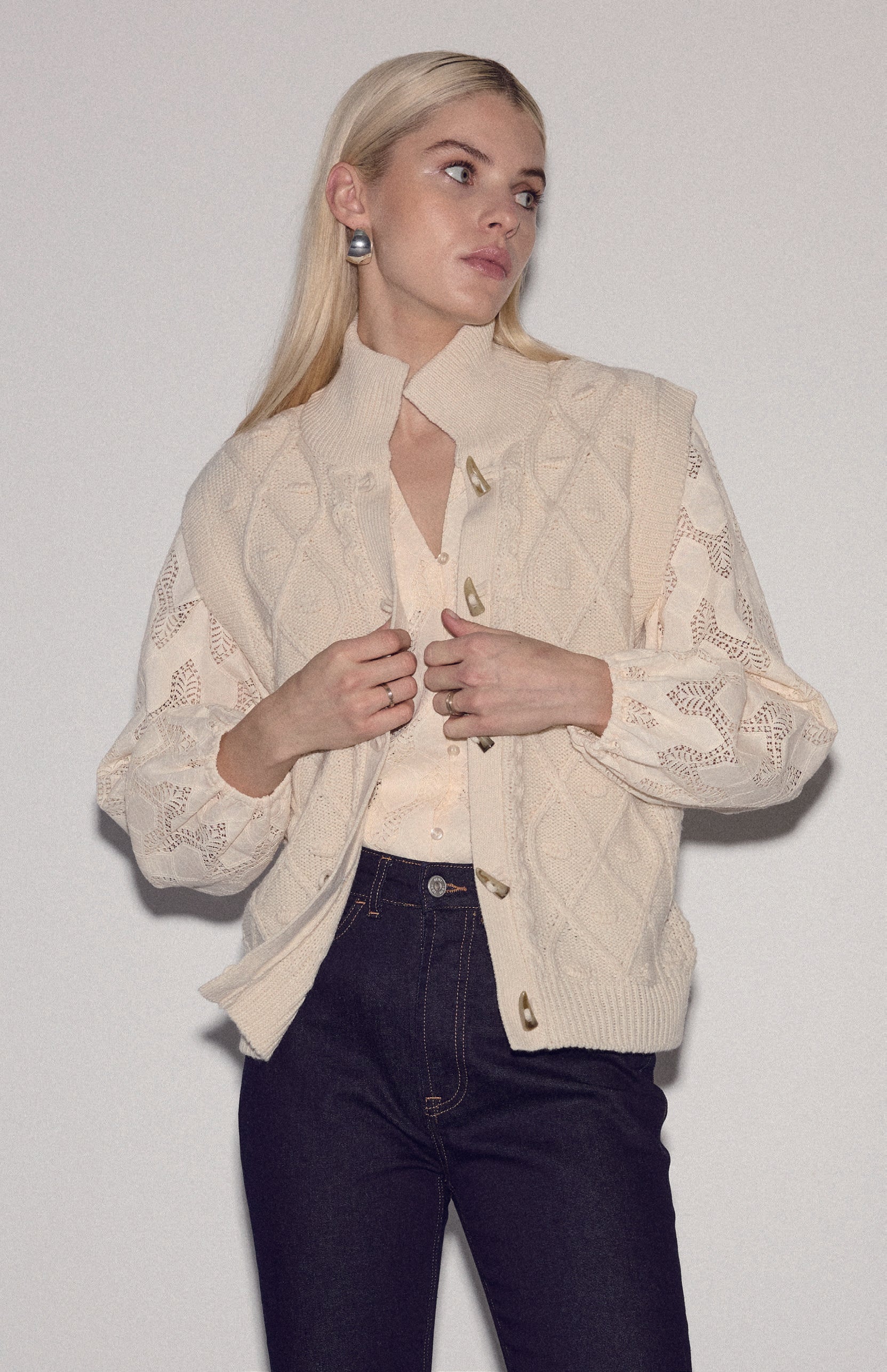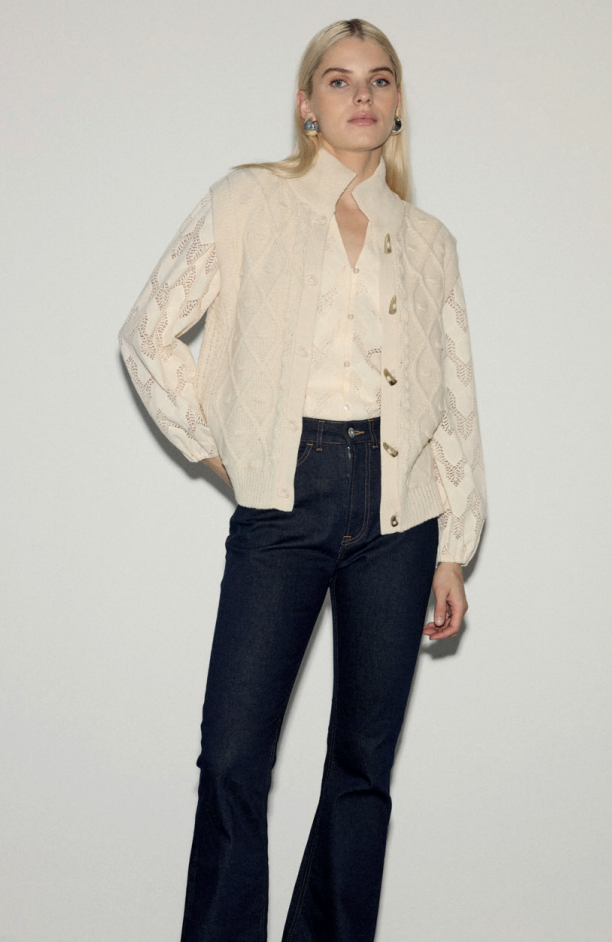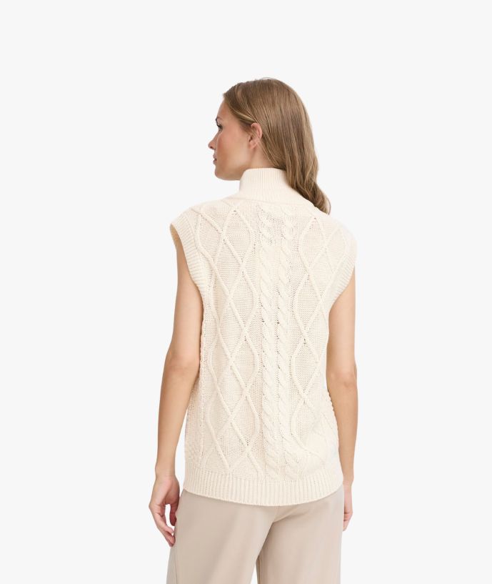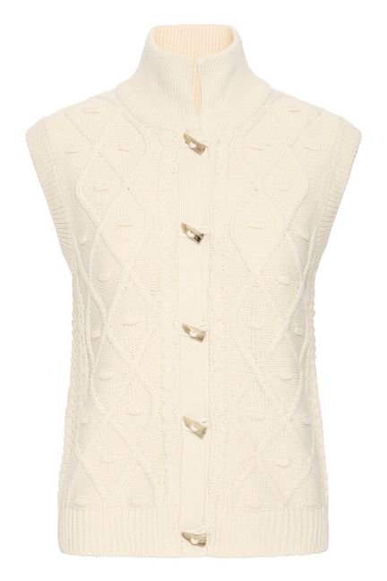 El chaleco de punto Doria combina estilo clásico y confort. Su diseño trenzado y cuello alto acanalado aportan calidez, mientras que el cierre de palanca con efecto carey añade un toque distintivo y funcional. Perfecto para superponer y crear looks versátiles.