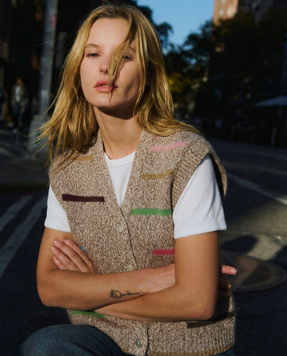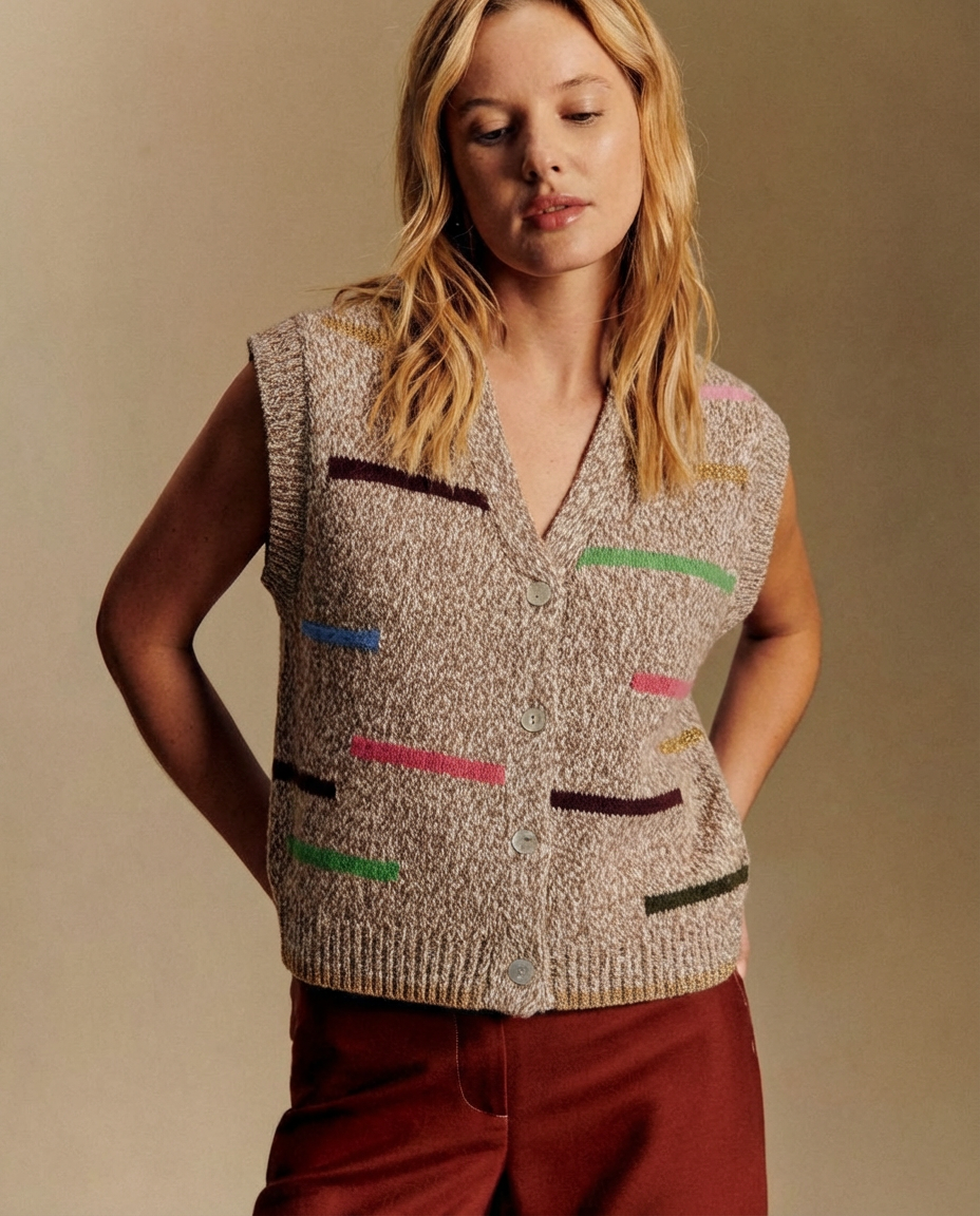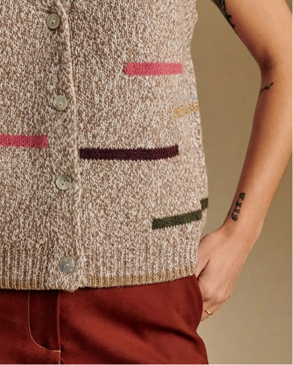 Divertido, colorido y con un estilo relajado, este chaleco de punto es una versión revisitada para animar tu día a día. Confeccionado en un suave punto beige jaspeado, presenta un favorecedor escote en V, mangas cortas y cierre de botones. El toque de detalles de puntadas multicolores en tonos rosa, verde, amarillo y chocolate le da un toque divertido a un corte clásico.