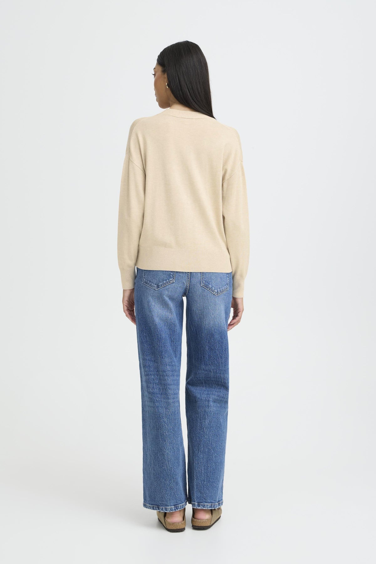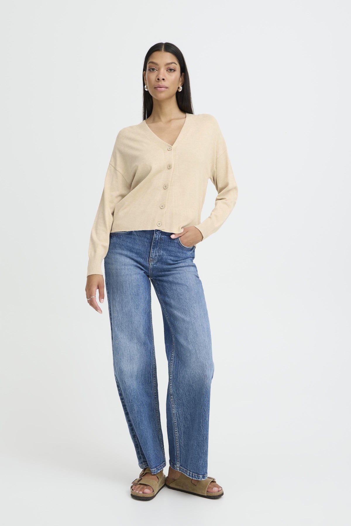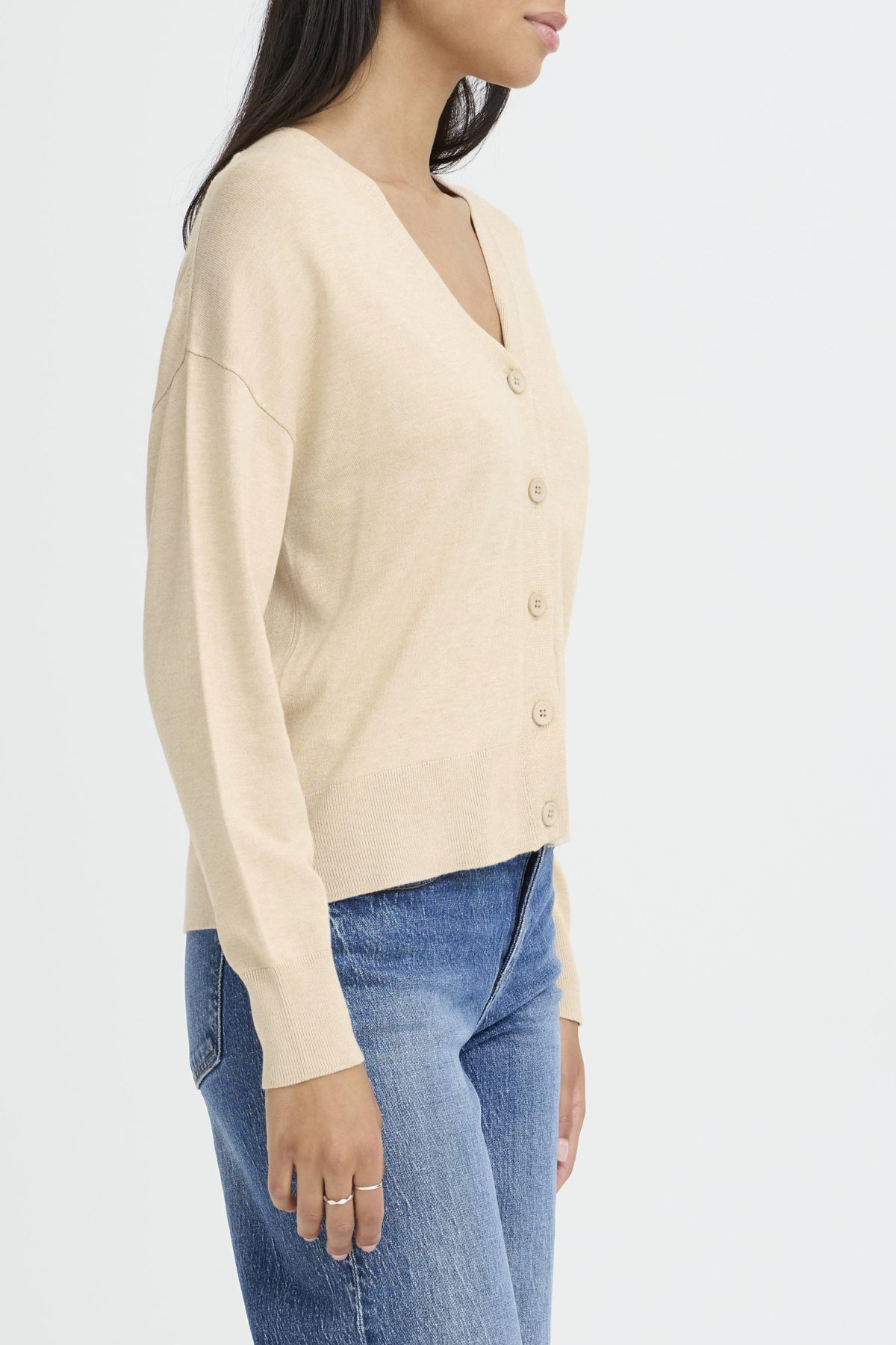 Chaqueta de punto fino de tacto suave. Con cuello en pico, manga larga y cierre de botones.