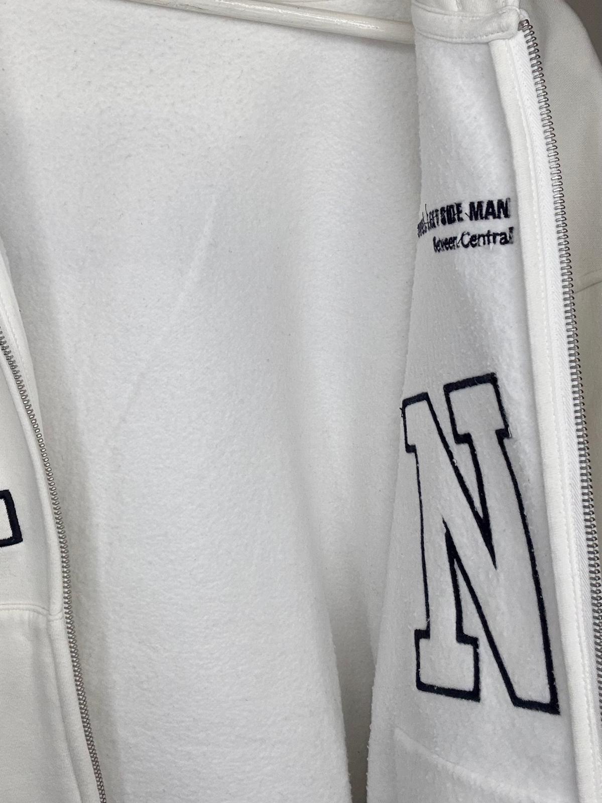 Chaqueta con capucha y cremallera frontal, de corte relajado y estética universitaria. Pieza de segunda mano en perfecto estado, cómoda y versátil para el uso diario.
