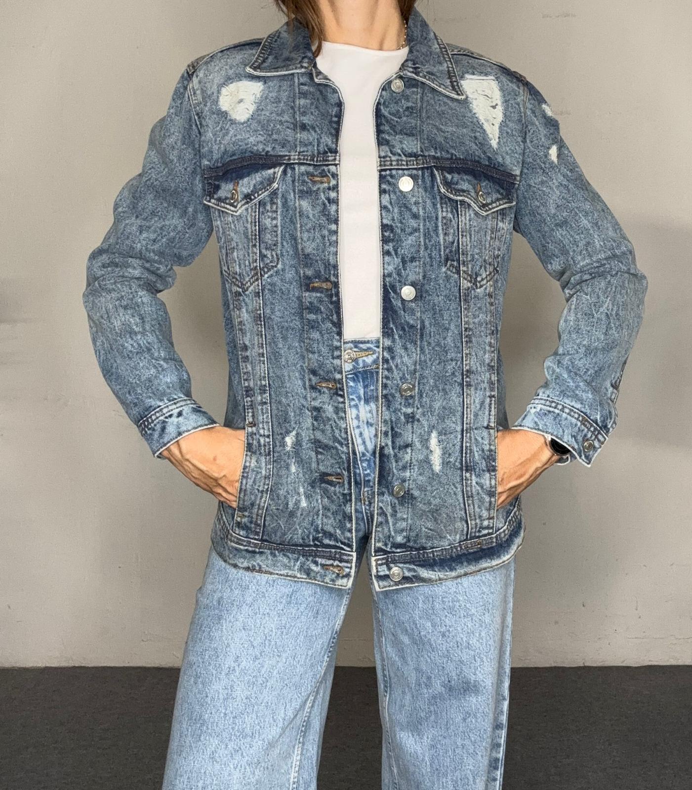 Palabras clave: chaqueta vaquera, denim azul, desgastados, vintage, casual, Stradivarius, resistente, estilo, versátil