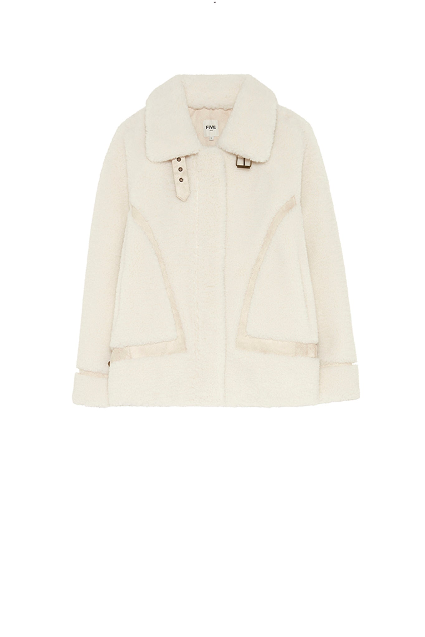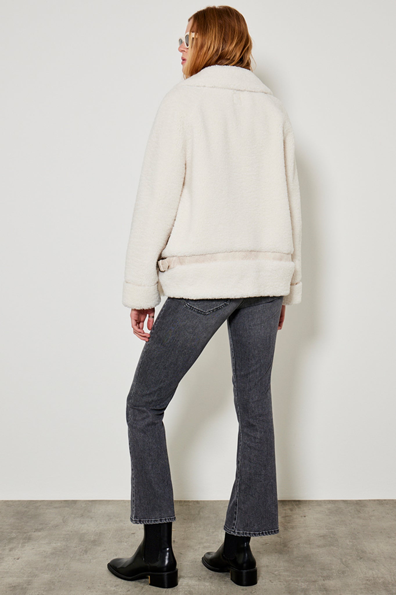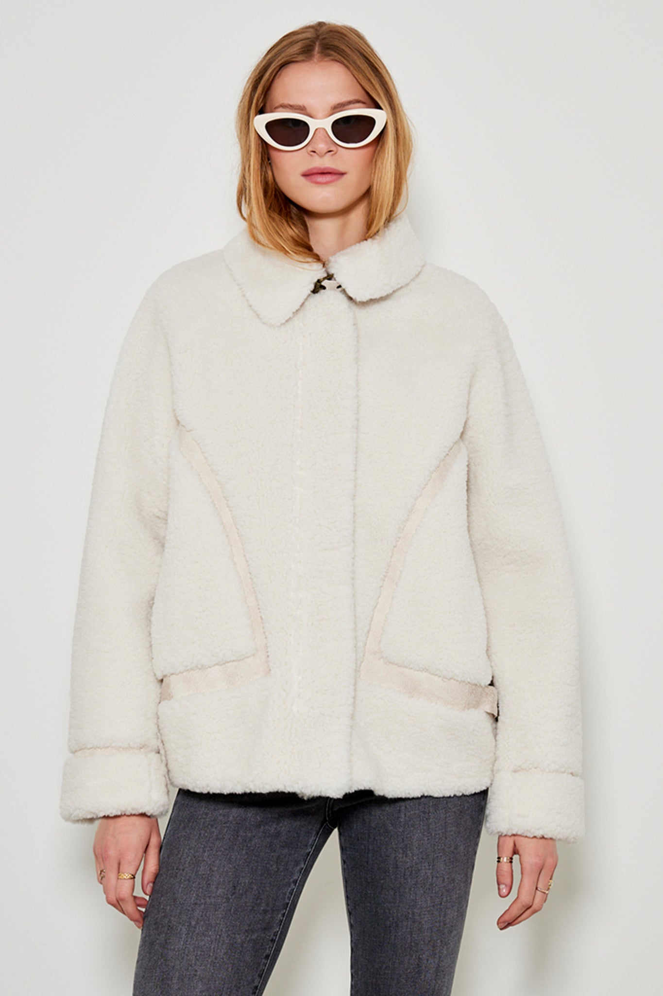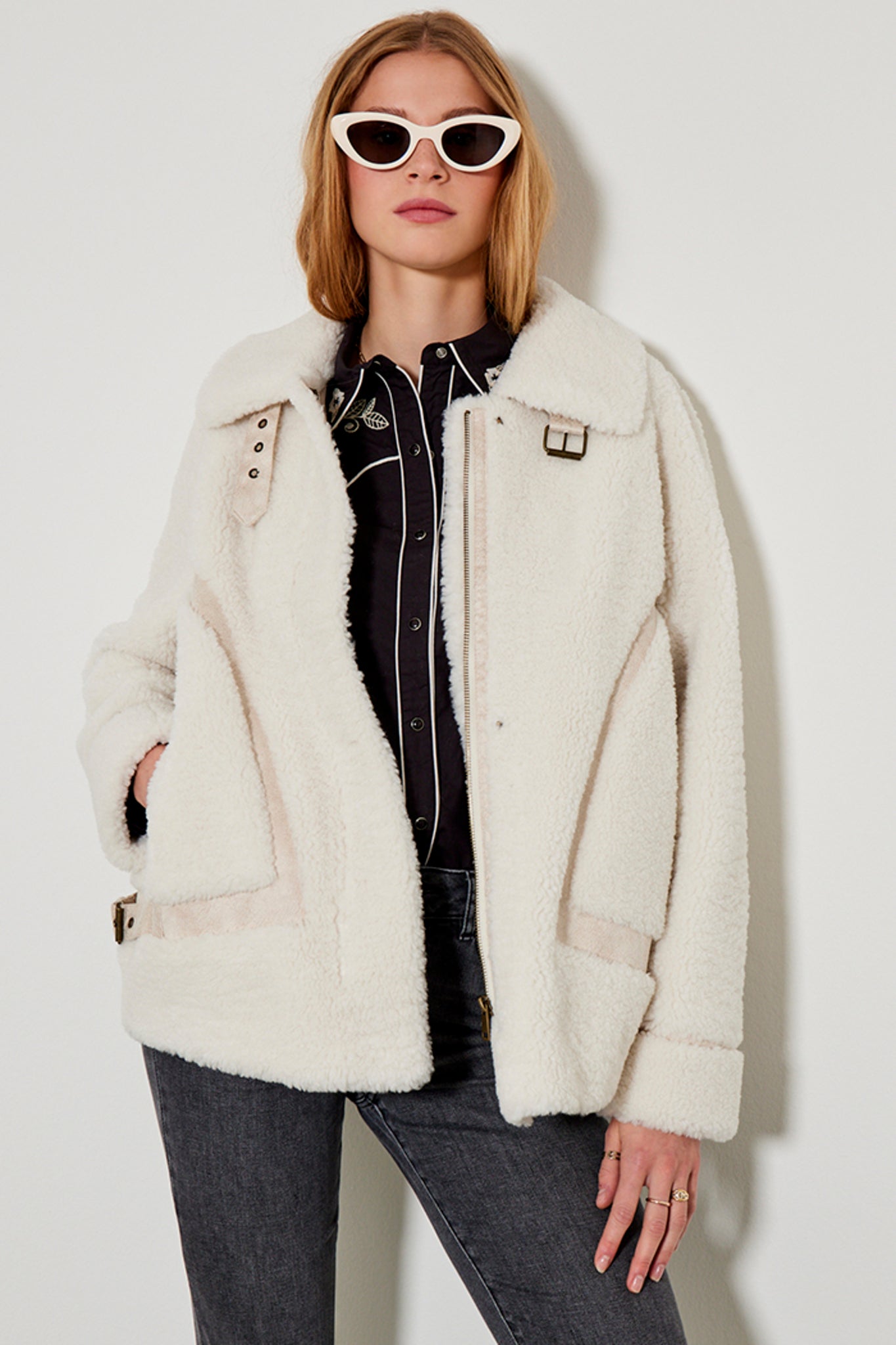 Esta chaqueta es un abrigo corto de corte recto con cierre de cremallera y dos bolsillos frontales. Su color "ricotta" le da un aspecto cálido y versátil. Es ideal para mantener el estilo y la comodidad durante los días más fríos.