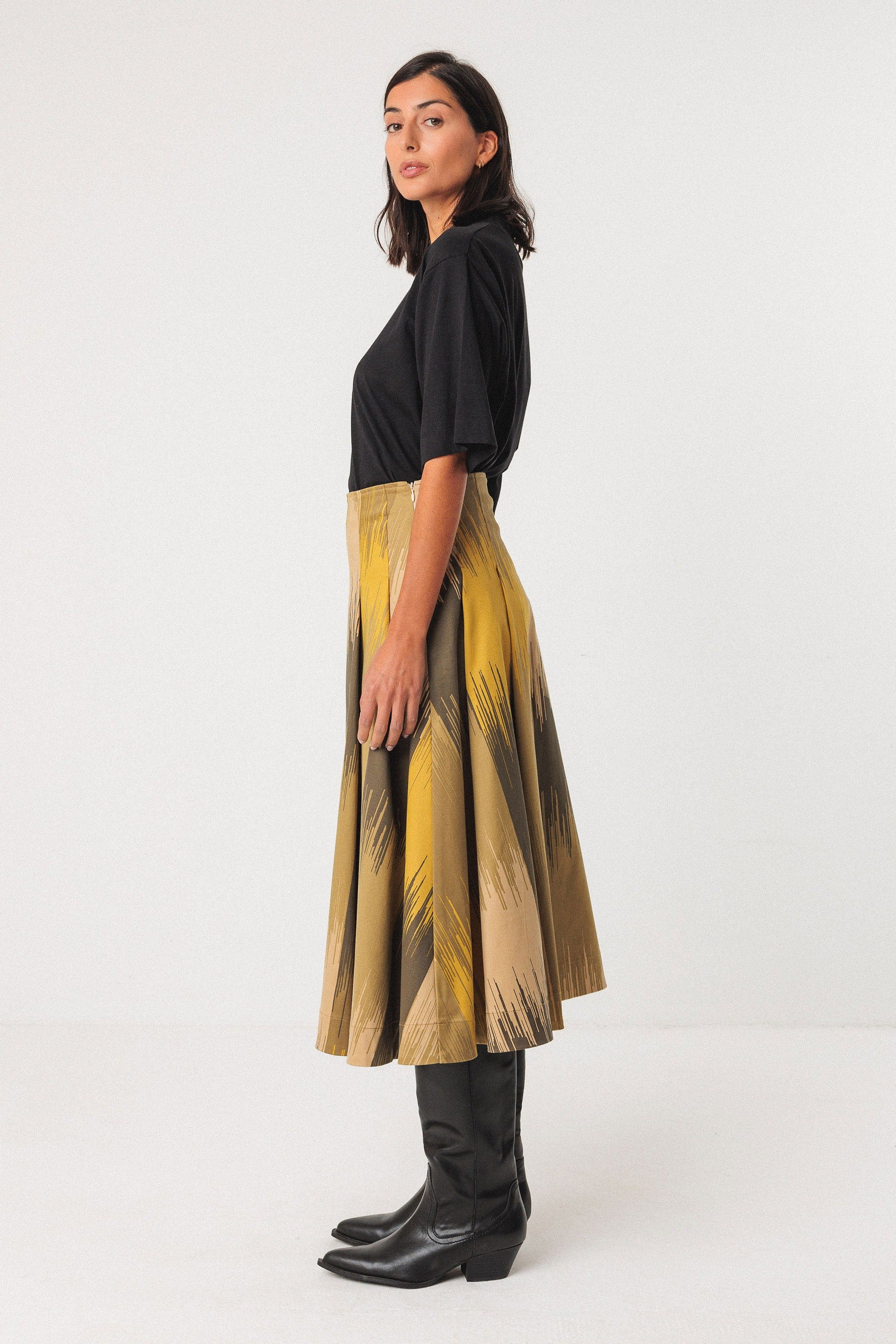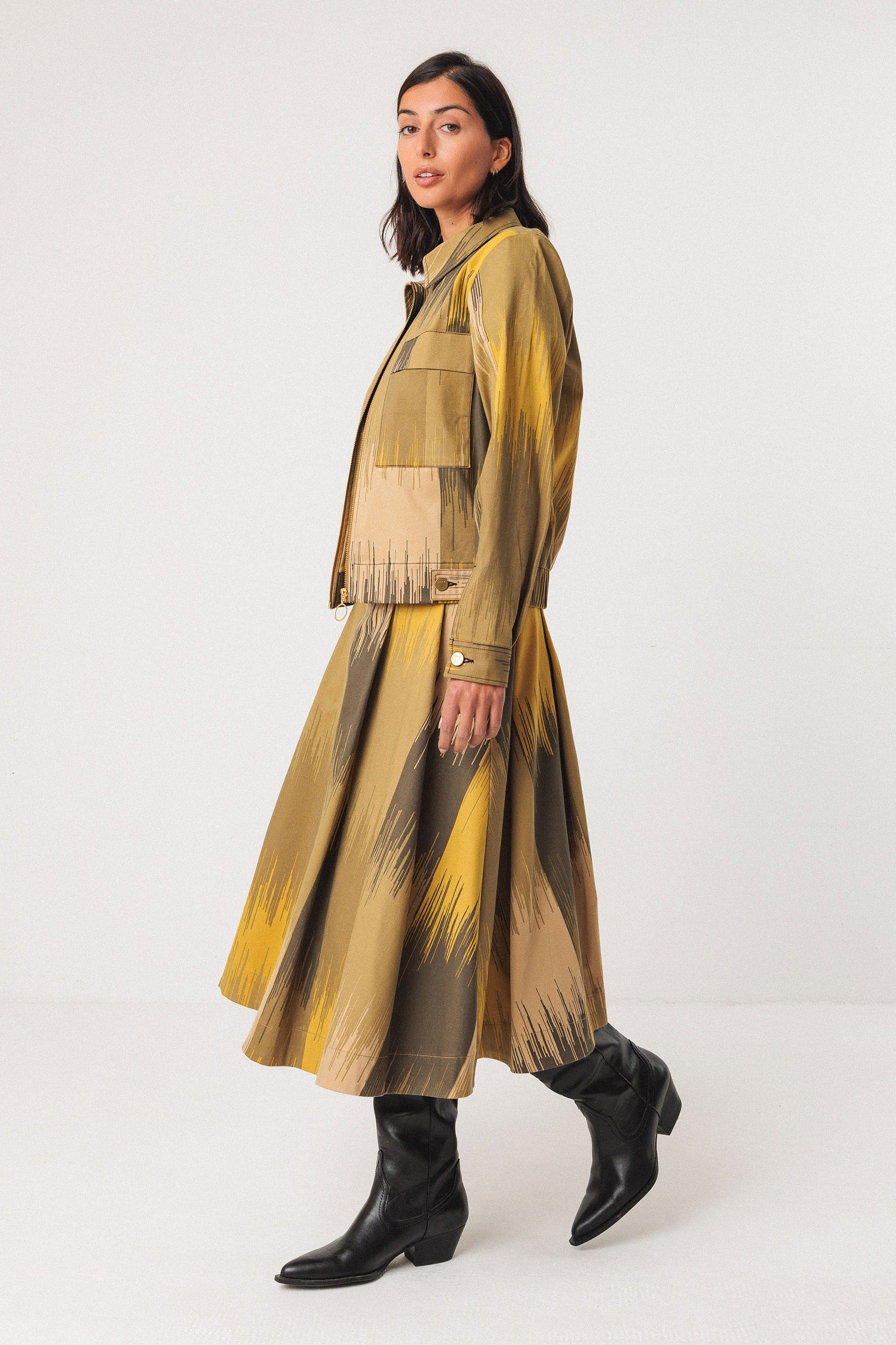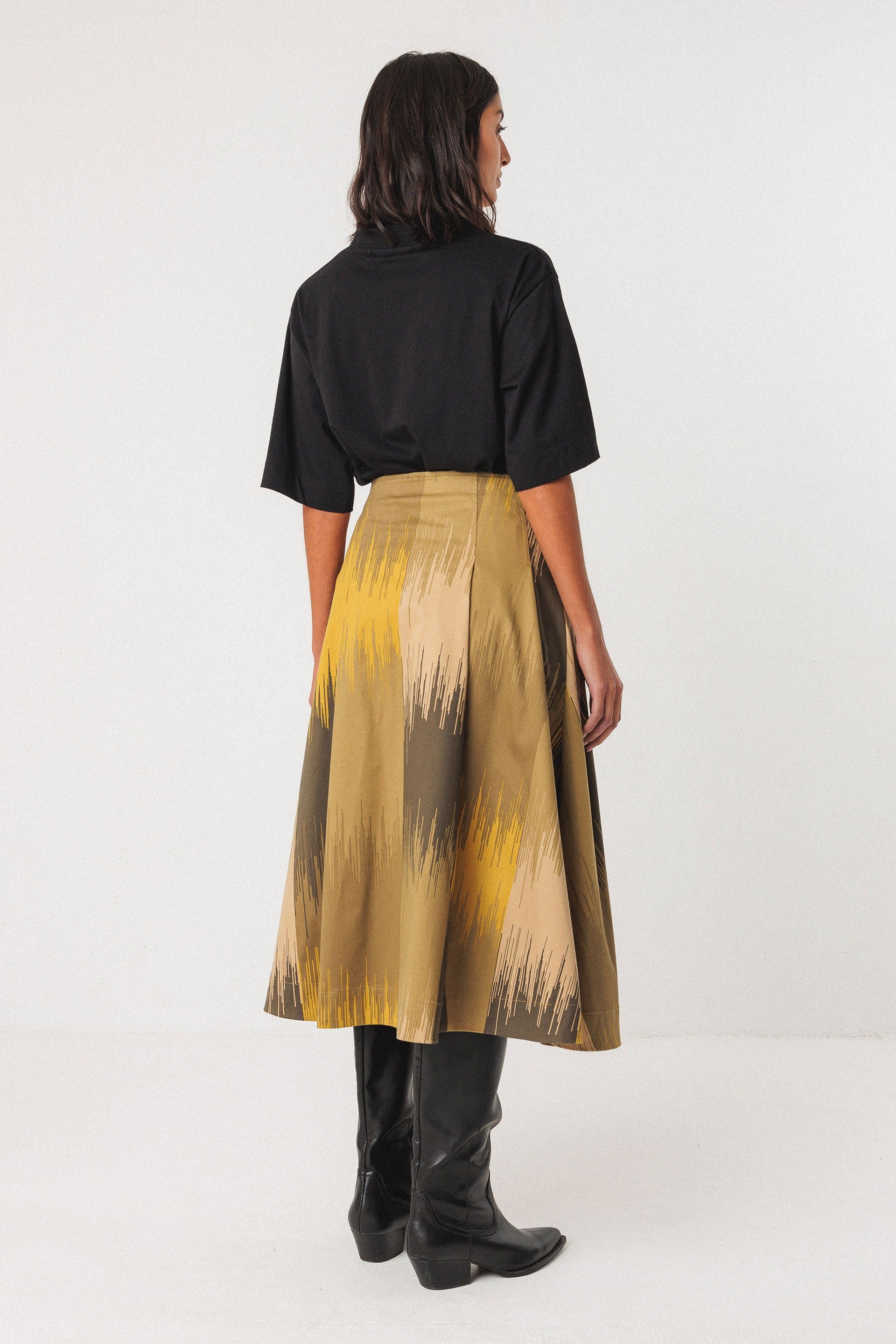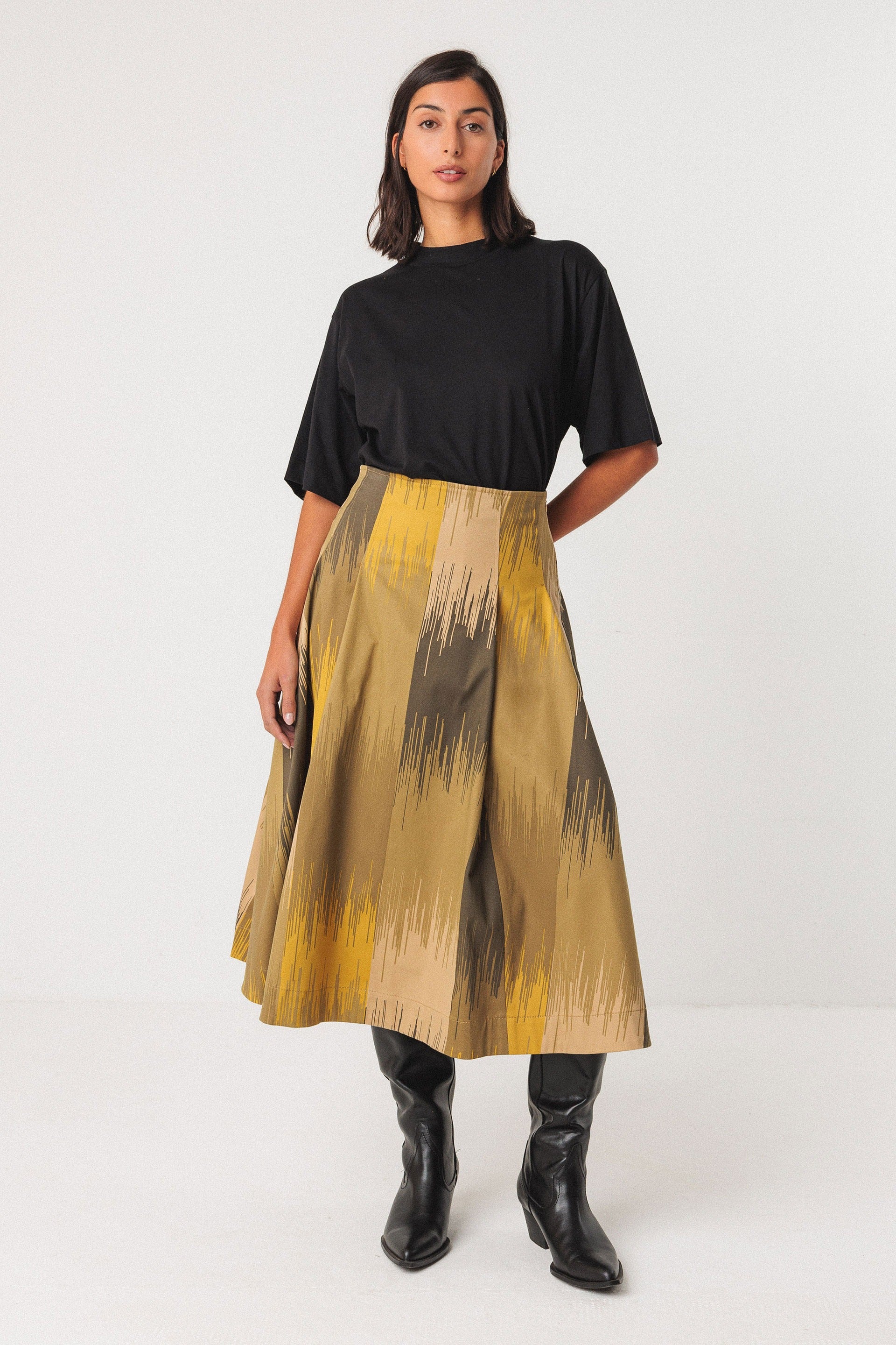 Falda acampanada de corte por debajo de la rodilla con bolsillos laterales y cierre de cremallera en un lado. Confeccionada con algodón orgánico. Talla grande, se recomienda elegir una talla menos.