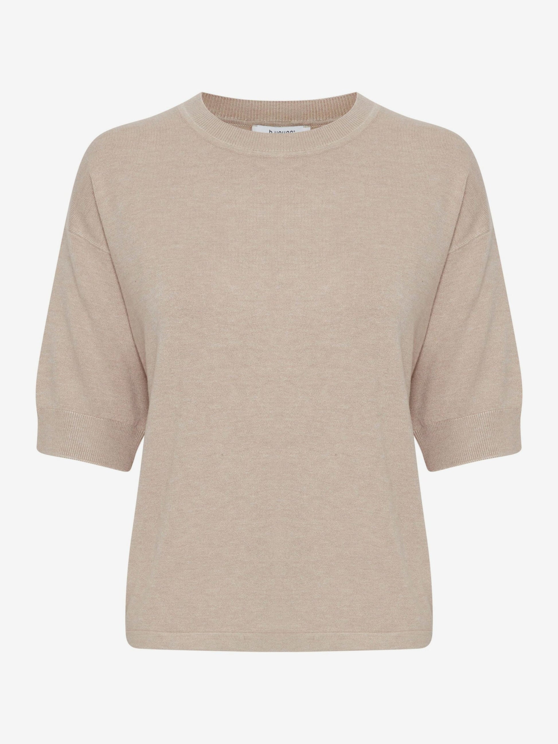 Jersey de punto fino en tono beige liso, con manga corta hasta el codo y corte regular. Su tejido suave y ligero, confeccionado con viscosa sostenible LENZING™ ECOVERO™, ofrece una caída natural y gran comodidad. Ideal para un look sencillo y elegante en cualquier ocasión.