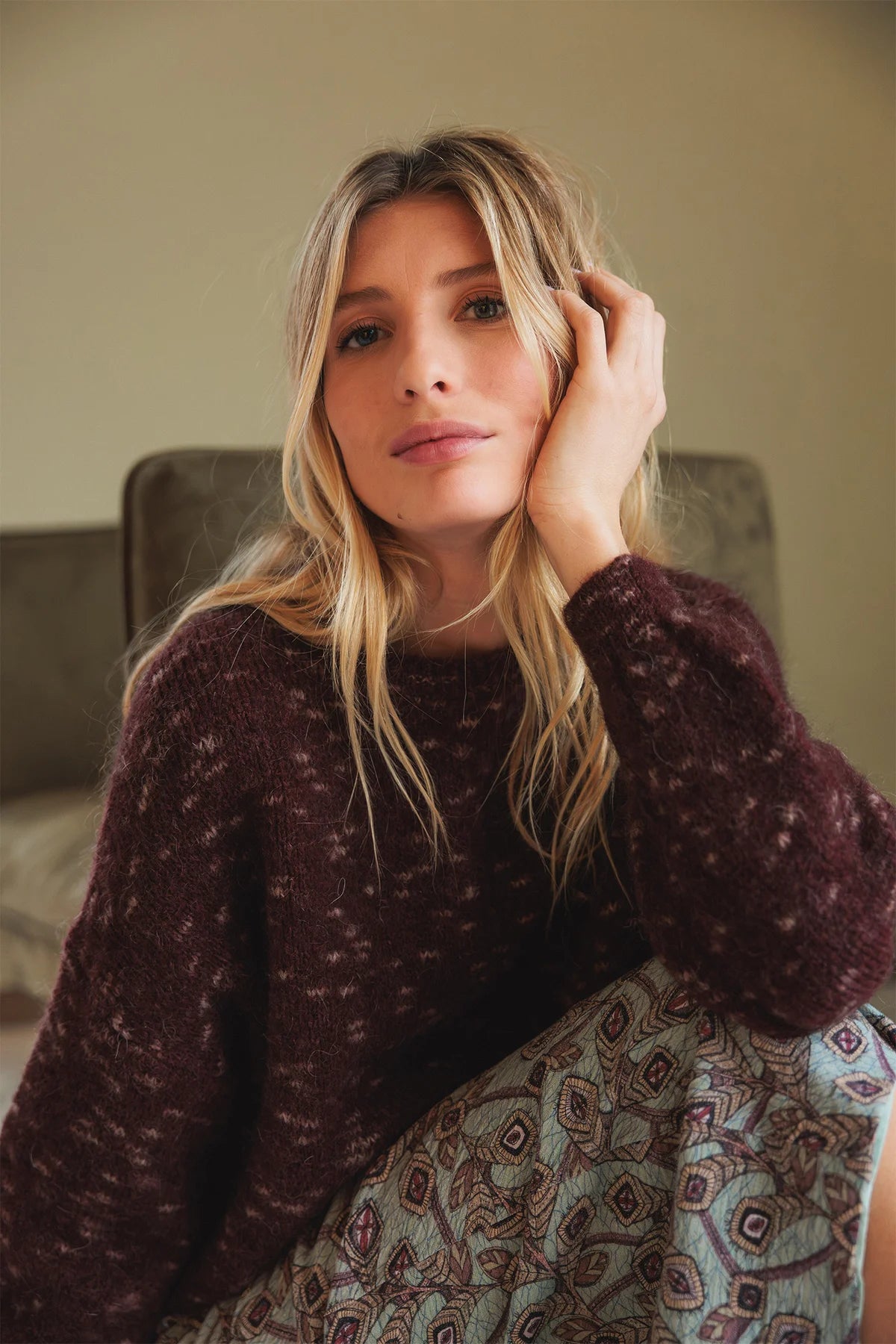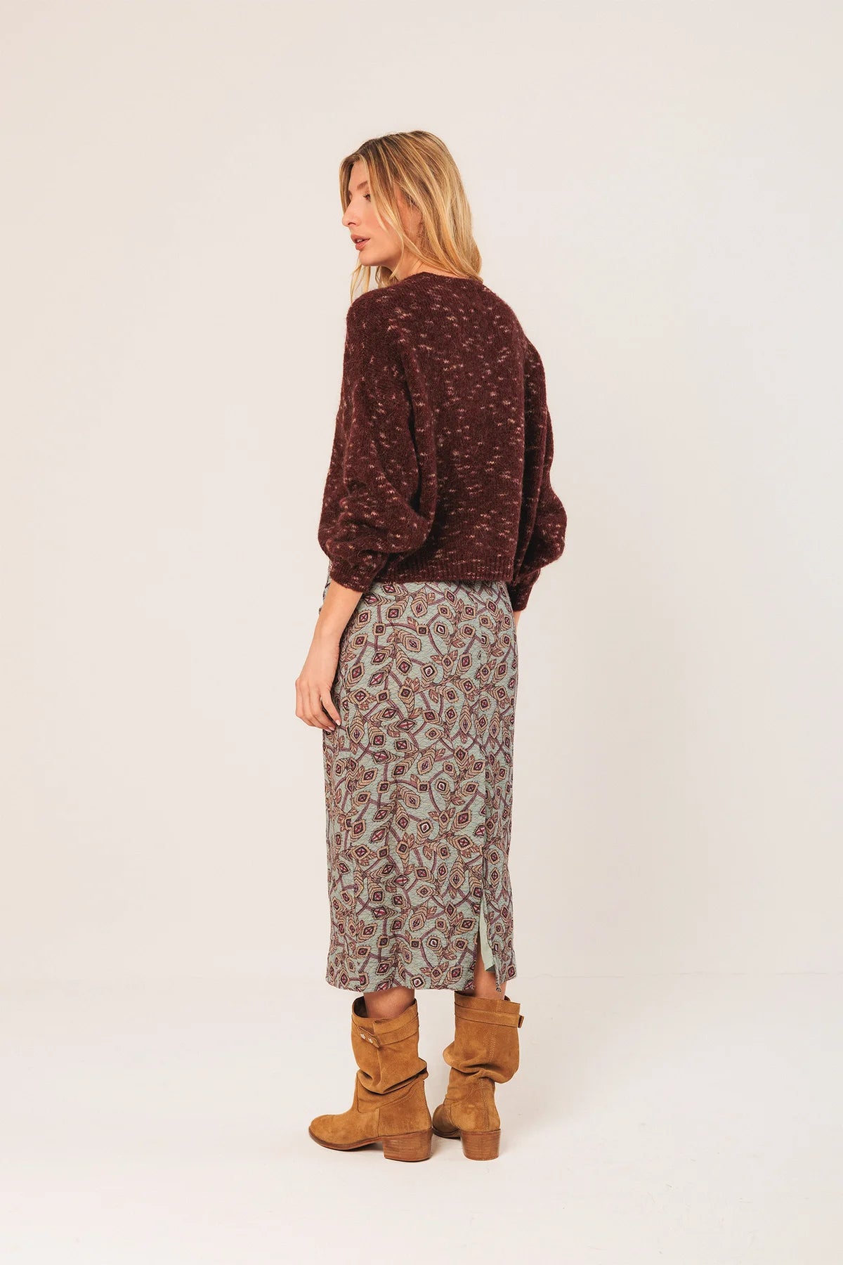 Jersey corto de punto mezcla con mohair, de silueta cuadrada y moderna. Su diseño abullonado en las mangas aporta volumen y calidez, convirtiéndolo en una prenda ideal para los días fríos.