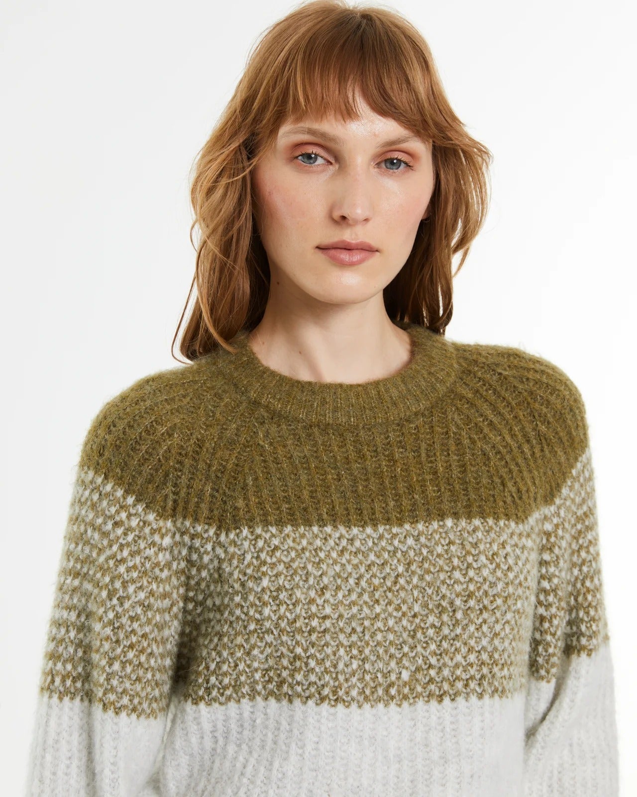 Jersey bicolor de escote redondo y manga ranglán, confeccionado con un suave punto que combina calidez y comodidad. Presenta acabados de canalé en el cuello, los puños y el bajo para un ajuste cómodo y estructurado. Corte regular fit, ideal para un estilo casual y versátil.