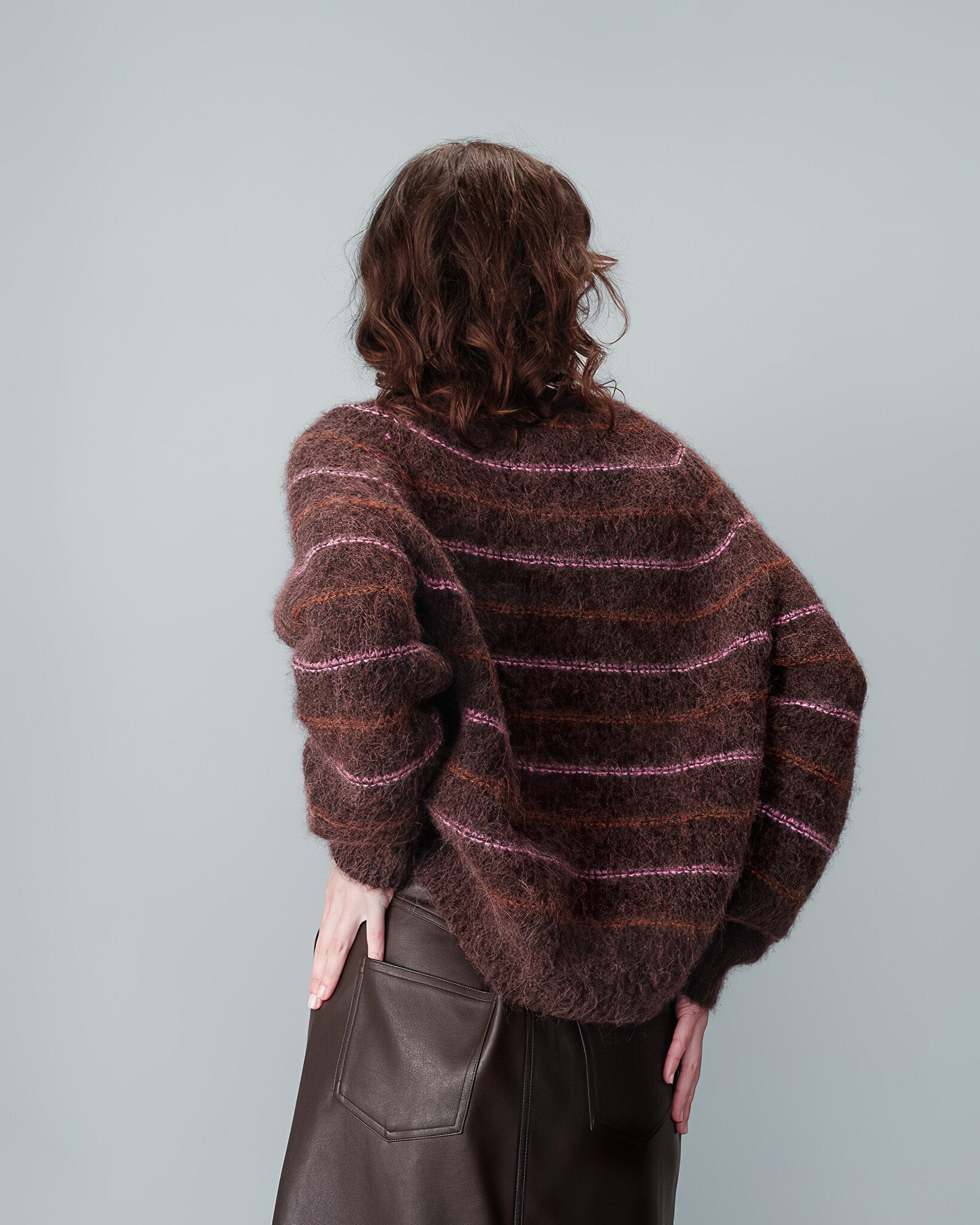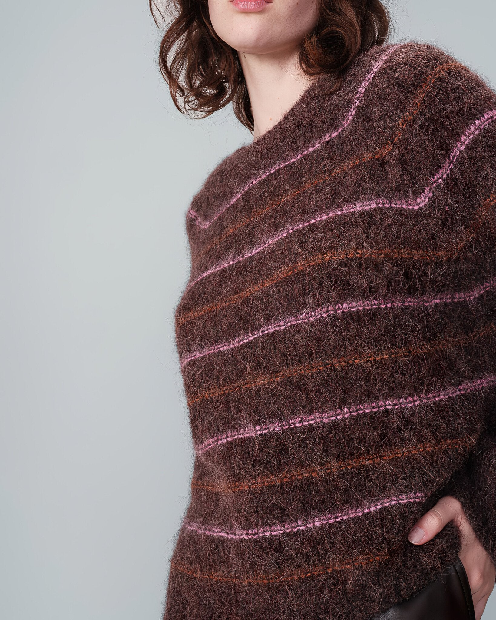 Este jersey destaca por su pequeño escote redondo y mangas largas, confeccionado en un tejido de hilo grueso que asegura calidez y comodidad. Las sisas raglán le dan una forma fluida, mientras que las rayas de dos tonos aportan un toque elegante y moderno. Con su gran volumen, este jersey combina estilo y confort, ideal para días fríos y looks casuales.