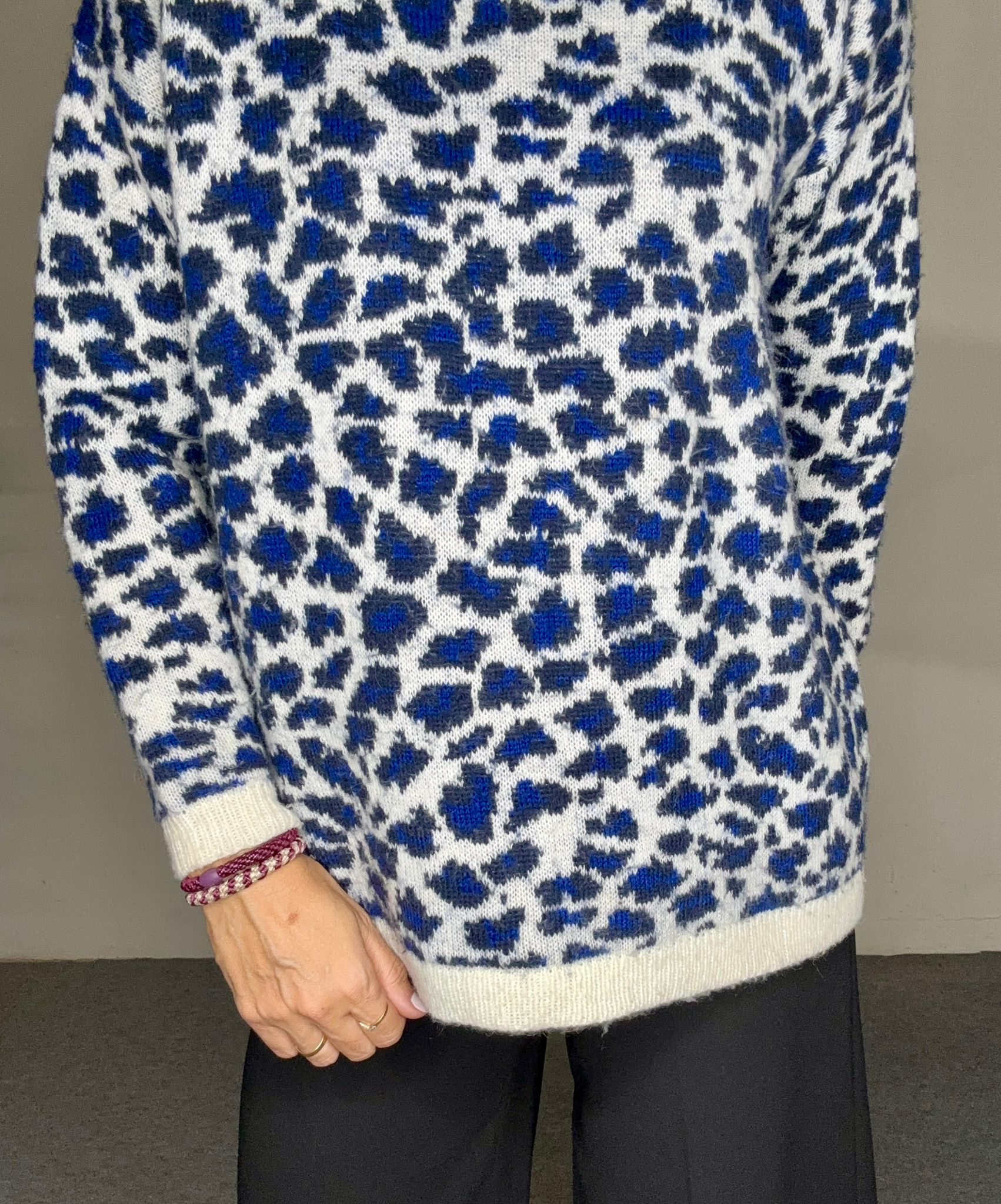 Jersey en azul klein y blanco con estampado de leopardo de MANGO, ideal para quienes buscan un toque atrevido y moderno. Su diseño se completa con puños y cuello de canalé en blanco, aportando contraste y estructura. Suavidad, estilo y personalidad en una sola prenda.