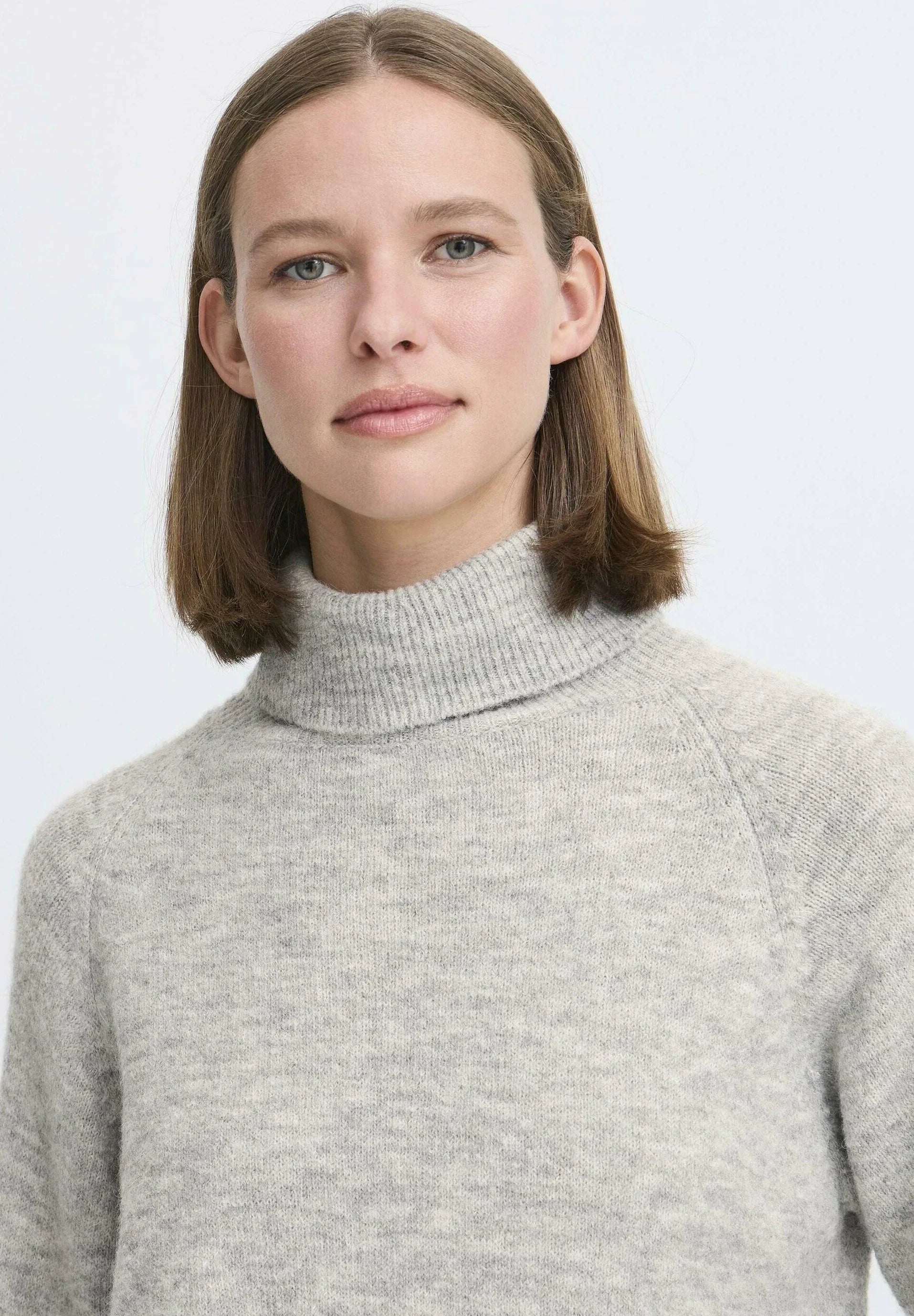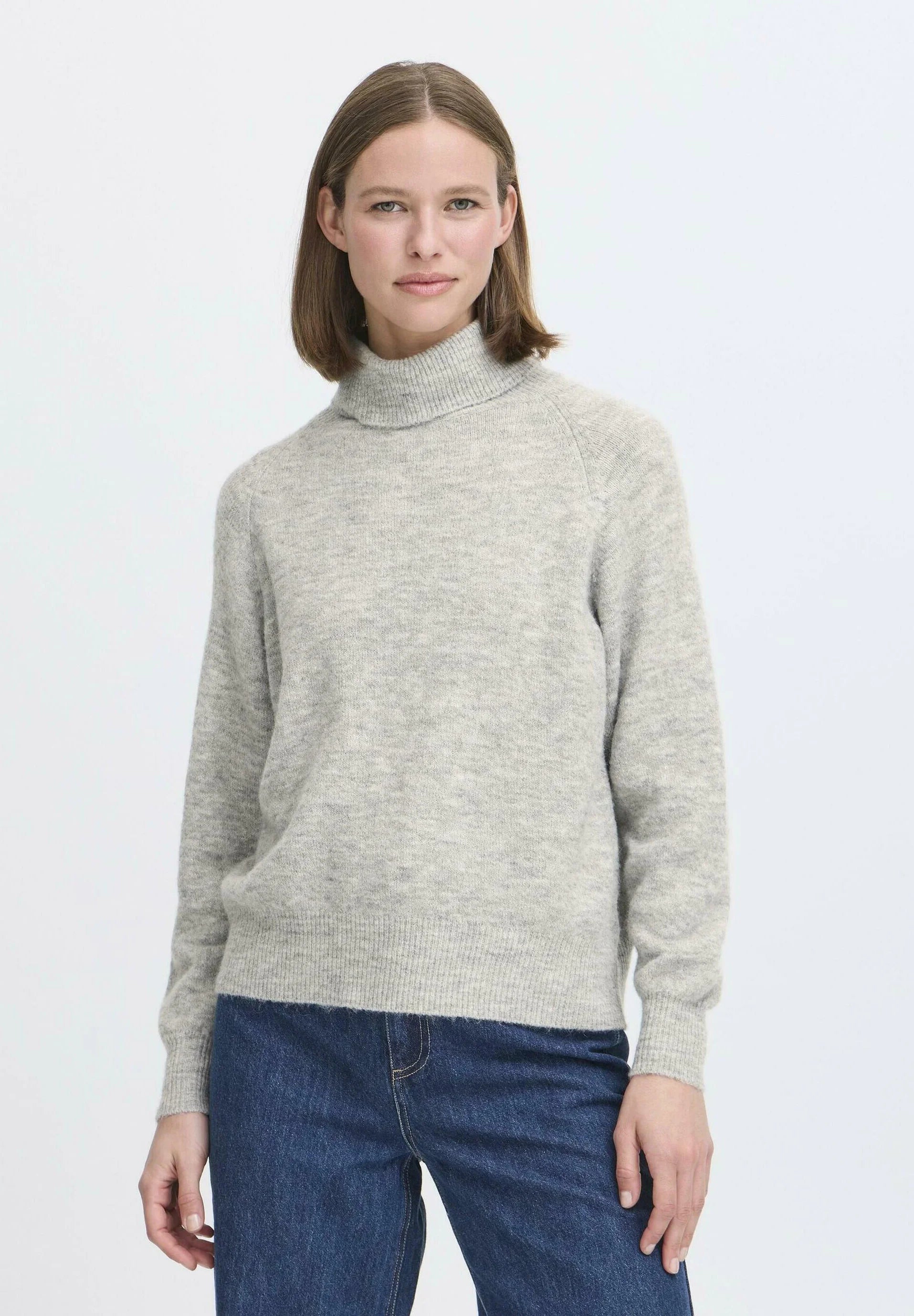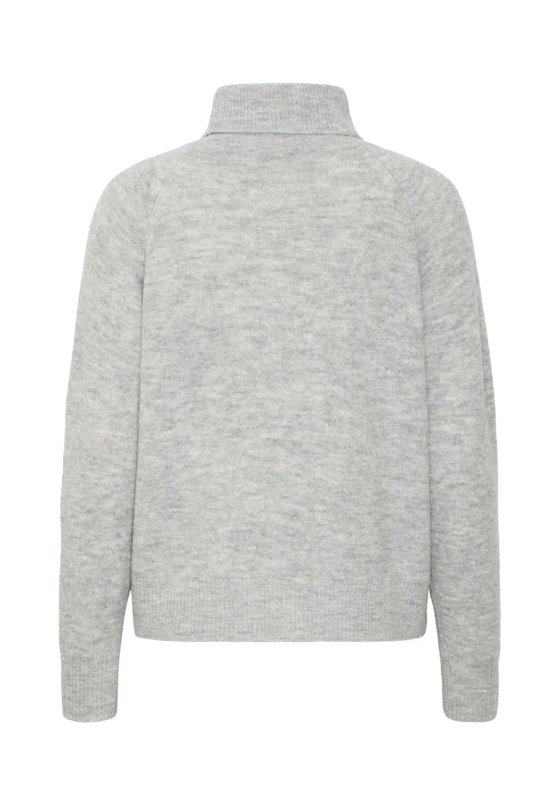 Jersey de punto gris jaspeado claro con cuello vuelto y textura de canalé que aporta calidez y estilo. Su corte regular y forma recta lo convierten en una prenda cómoda y versátil, ideal para looks invernales con un toque suave y natural gracias a su mezcla con lana de alpaca.
