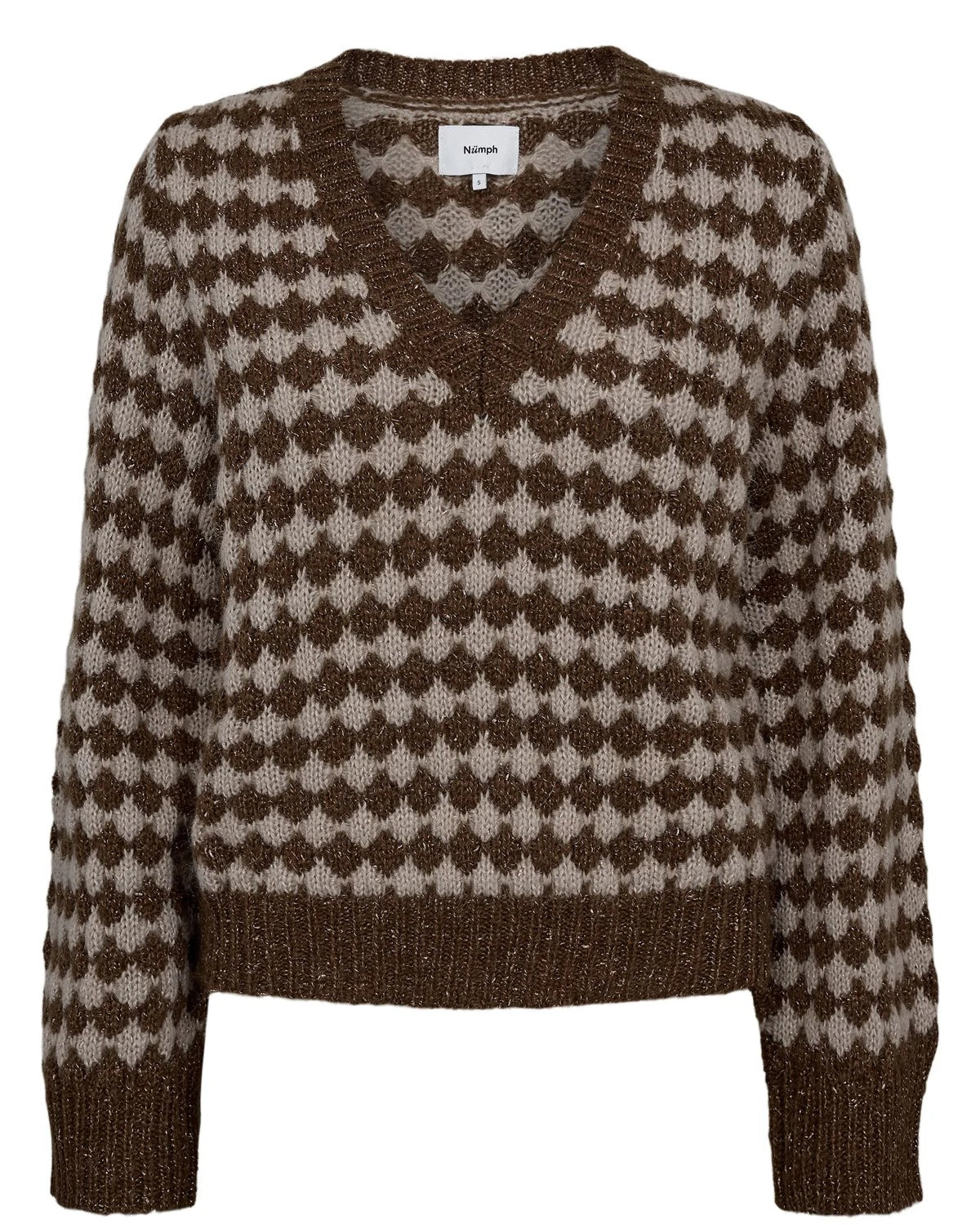 Jersey de punto con escote en V y diseño geométrico en tonos marrones. Su textura suave combina hilos metálicos que aportan un sutil brillo y un toque distintivo. Los acabados acanalados en cuello, puños y bajo completan un diseño cálido, cómodo y con un aire retro muy actual.