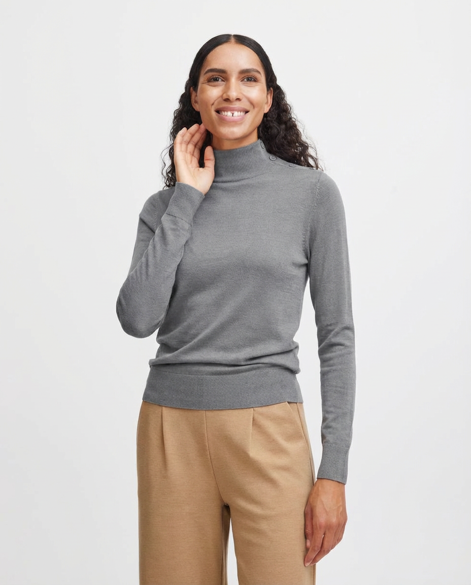 Este jersey tiene ese toque suave y fluido que amarás instantáneamente, como una caricia constante. El cuello alto con canalé fino le da un rollo clásico, mientras que los cuatro botones tono sobre tono en el hombro son como el toque moderno que no sabías que necesitabas.