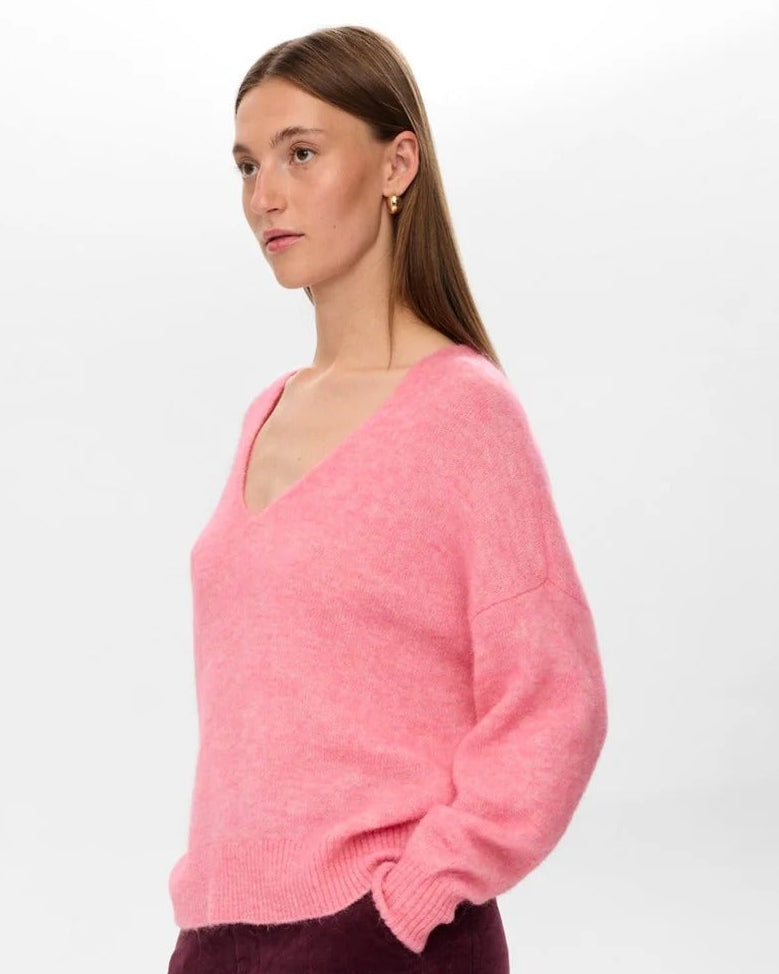 El jersey RITA destaca por su tono de algodón de azúcar y su tejido fino que aporta ligereza y suavidad. Con cuello pico y canalé en los puños, es una prenda delicada y femenina ideal para cualquier ocasión.