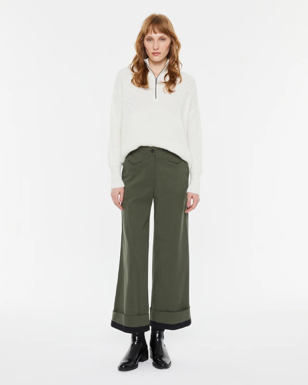 Jersey tipo polo con cuello Perkins y cierre delantero con cremallera metálica. Presenta un delicado detalle de trenza en la parte delantera y las mangas, que añade textura y un toque clásico. Su corte regular fit y mezcla de fibras lo convierten en una prenda cómoda, cálida y versátil para el día a día.