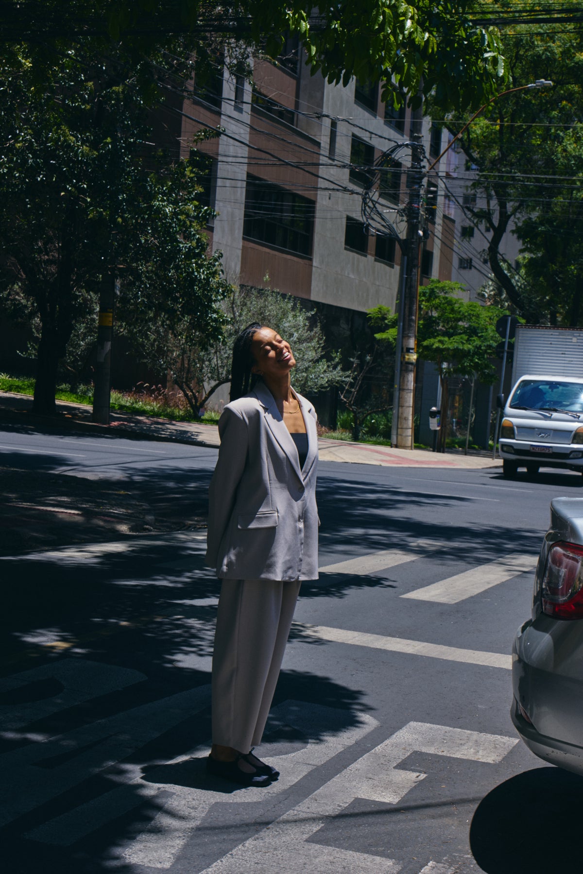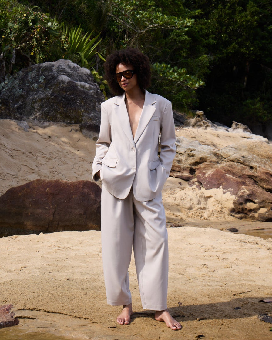 Los pantalones de pernera ancha presentan un corte relajado y entallado con pinzas delanteras y un acabado mate suave. Su largo hasta el tobillo crea una silueta moderna y definida para el día a día.