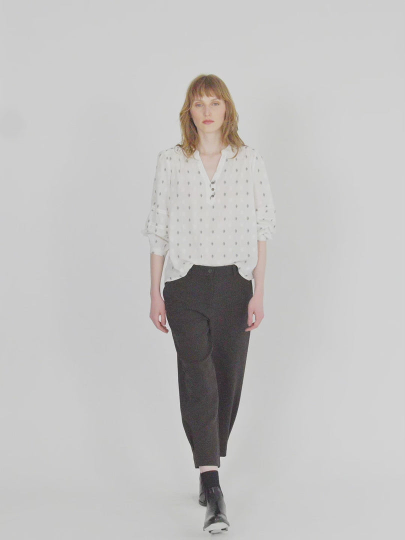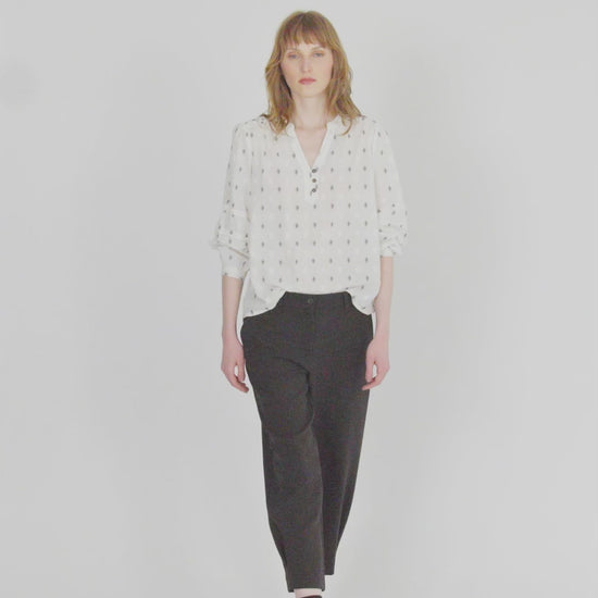 Pantalón de tiro alto con pinzas en el bajo que crean un favorecedor efecto bombacho. Incorpora bolsillos laterales y traseros con ojal, además de una cintura elástica en la parte posterior para mayor comodidad. Cierre frontal con botón y cremallera. Perfecto para looks urbanos con un toque sofisticado. Color marrón oscuro.