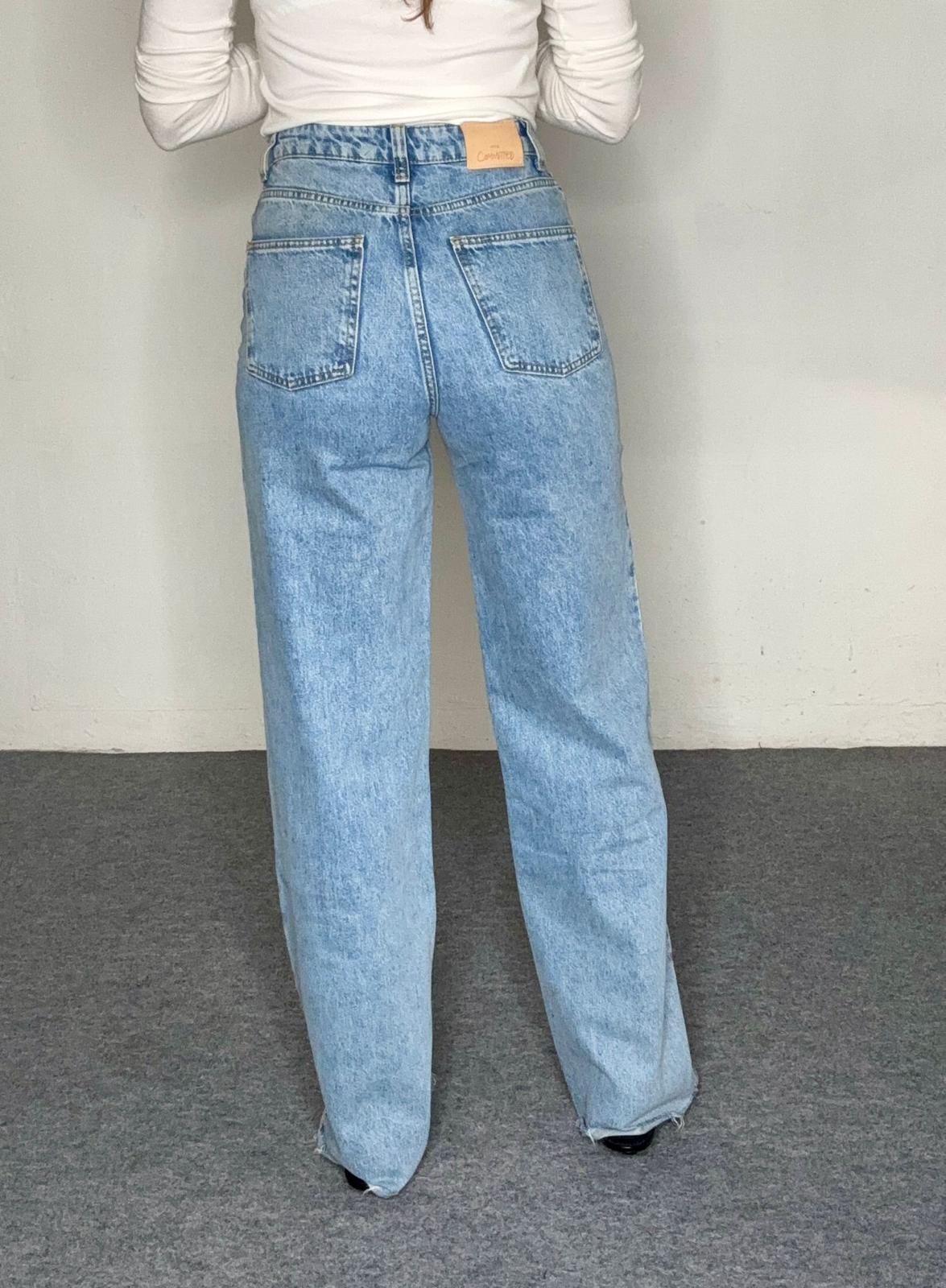 pantalón, pierna ancha, tiro alto, lavado denim, azul claro, sostenible, moderno