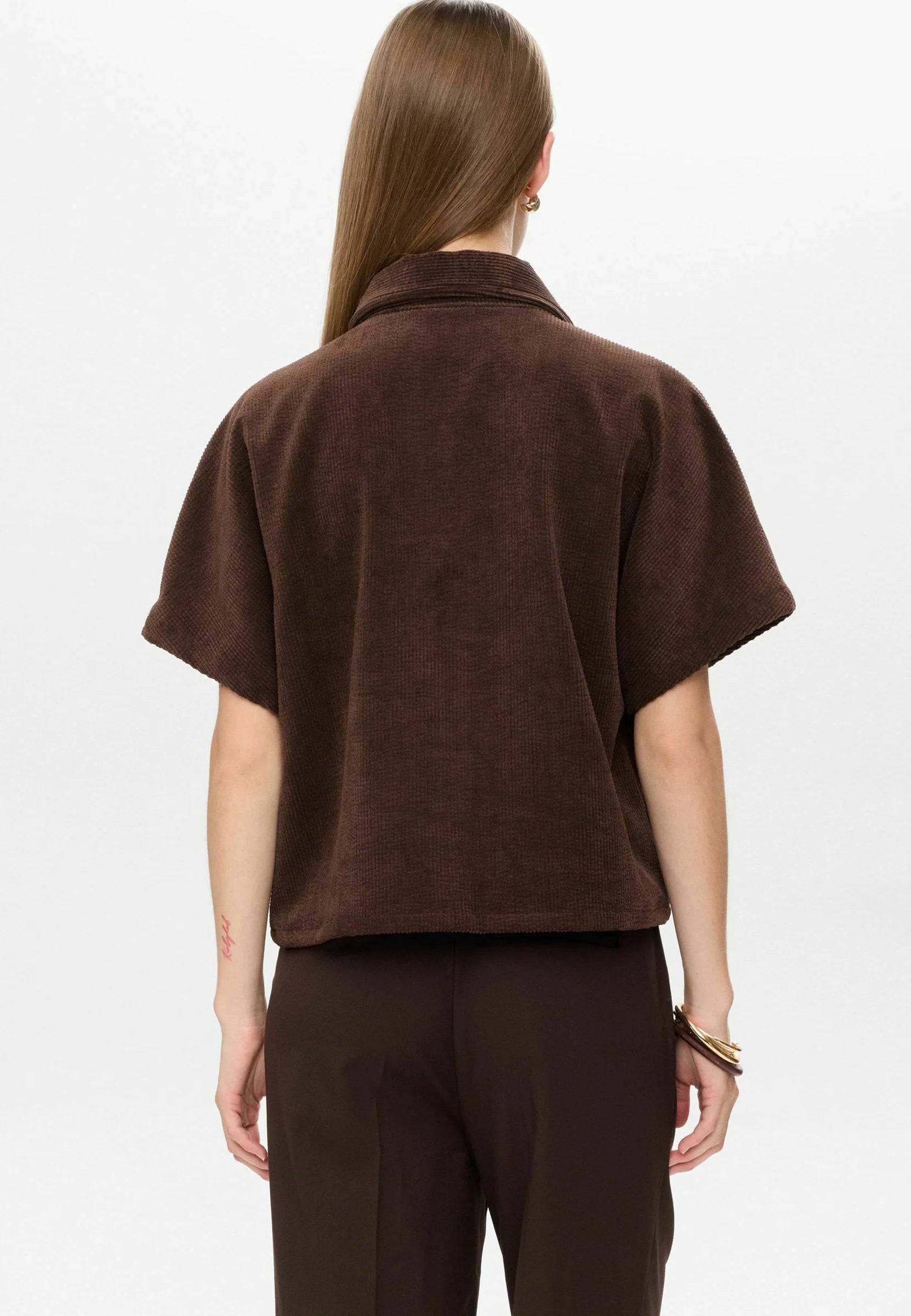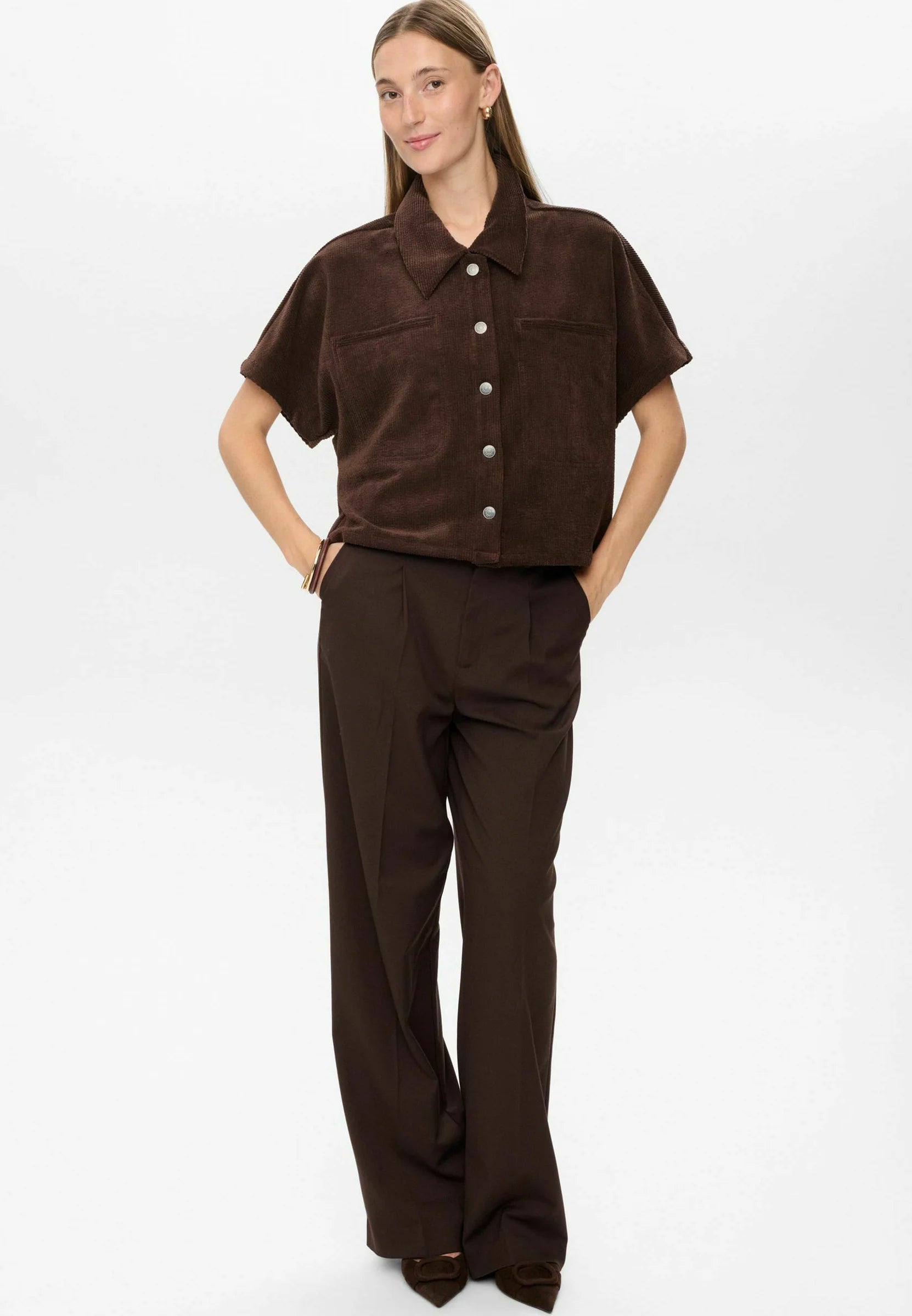 Sobrecamisa marrón chocolate de pana suave con manga corta, ideal para un look relajado pero con carácter. Su textura cálida y su corte versátil la convierten en una prenda clave, especialmente si la combinas con su pantalón a conjunto.