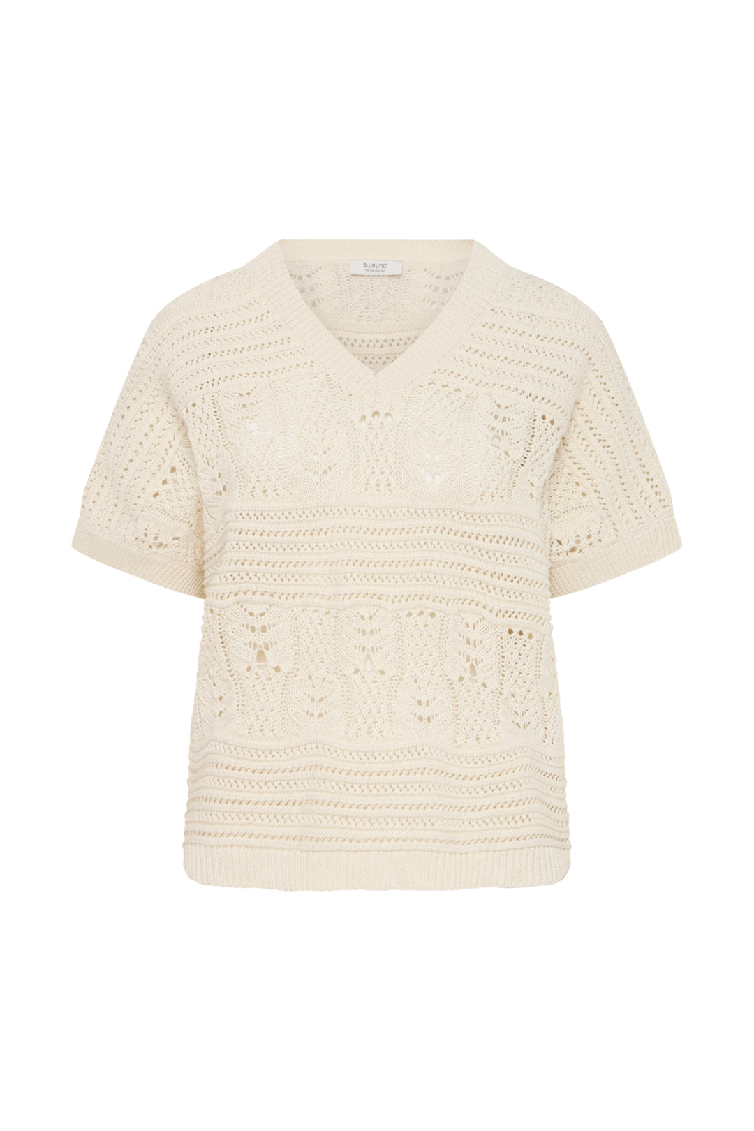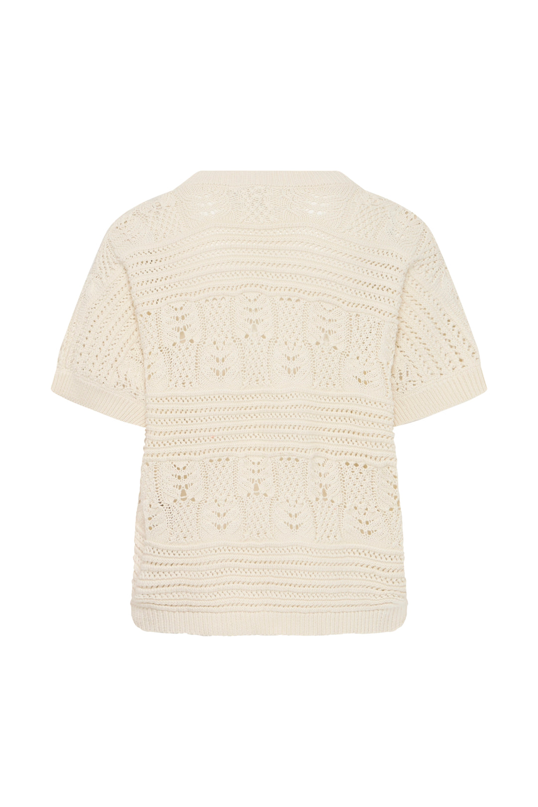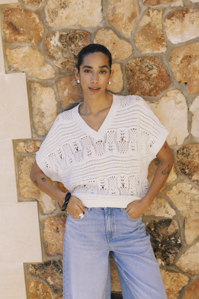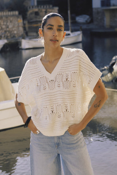 Suéter de punto calado de color crudo. Corte holgado y cuello pico. De manga corta y hombro caído le aporta un toque relajado.