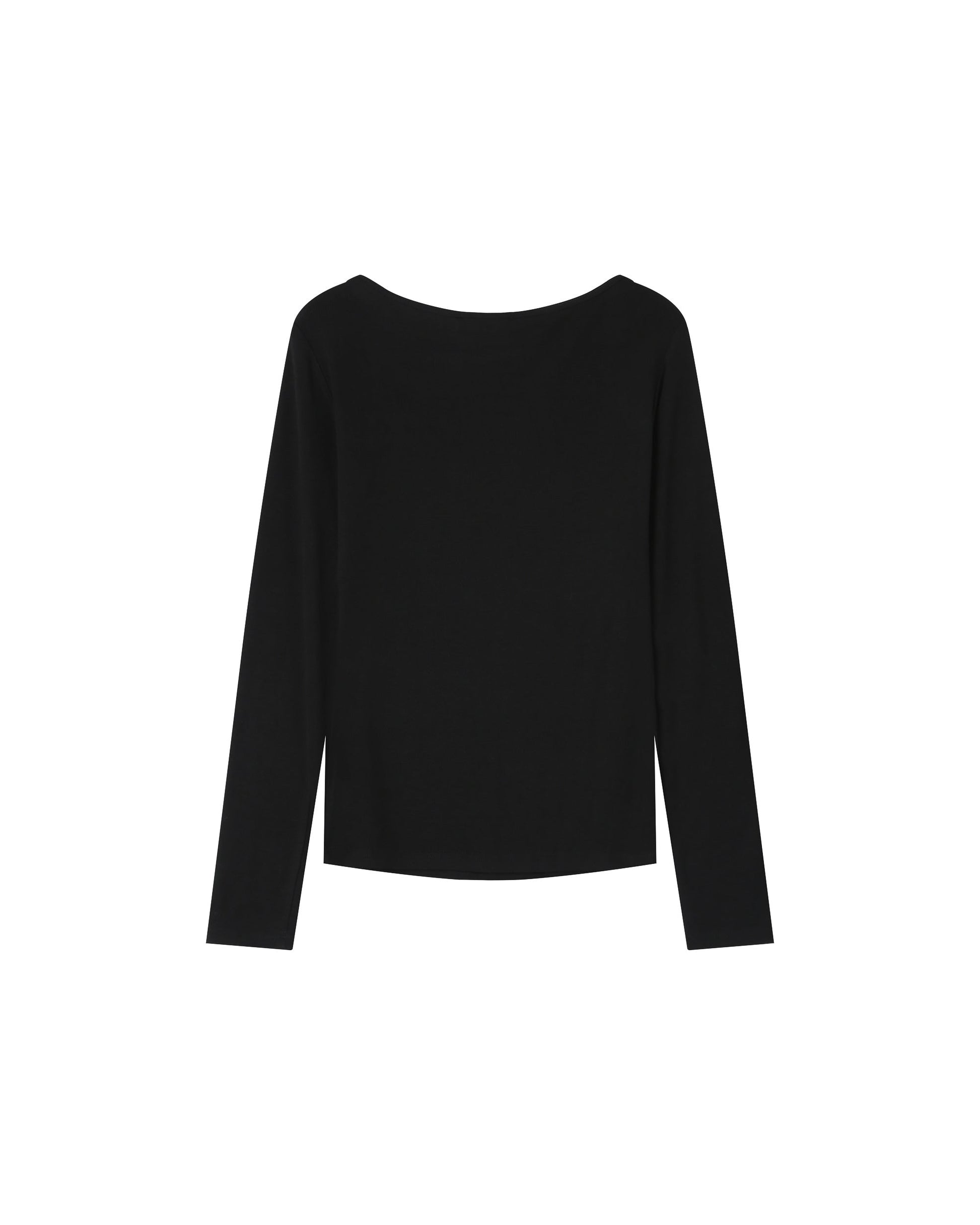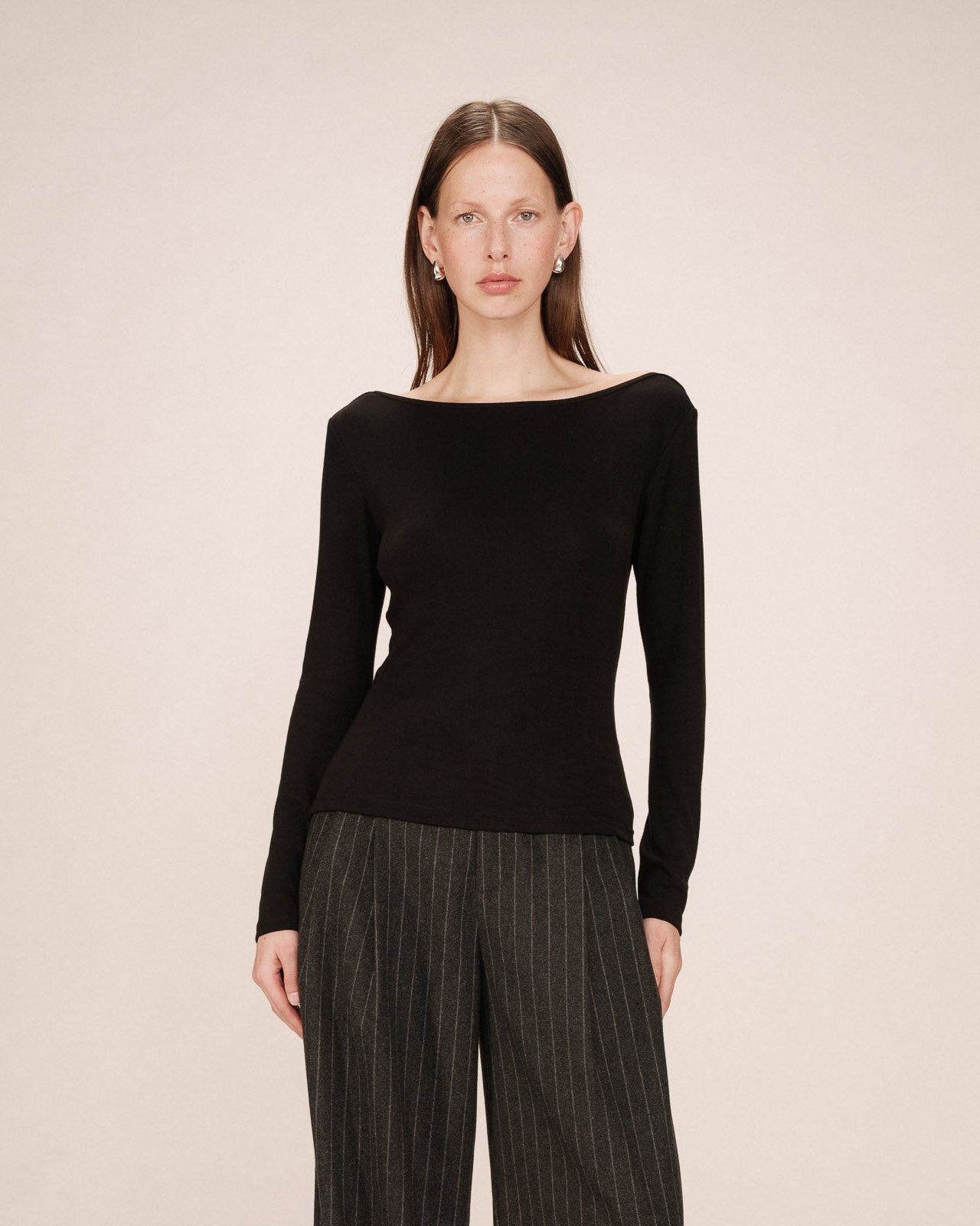 Camiseta de manga larga de líneas limpias y minimalistas, diseñada para un look femenino y estructurado. El corte ajustado realza la silueta, mientras que el escote barco se distingue por un acabado cruzado en los hombros. Color negro.