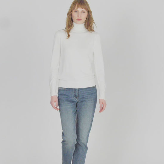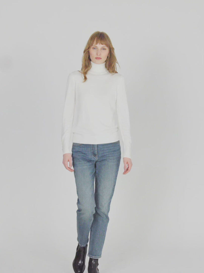 Vaquero recto de tiro alto, cinco bolsillos, cierre con botón metalizado y cremallera. Es un vaquero cómodo, elástico y favorecedor que realza tu figura.