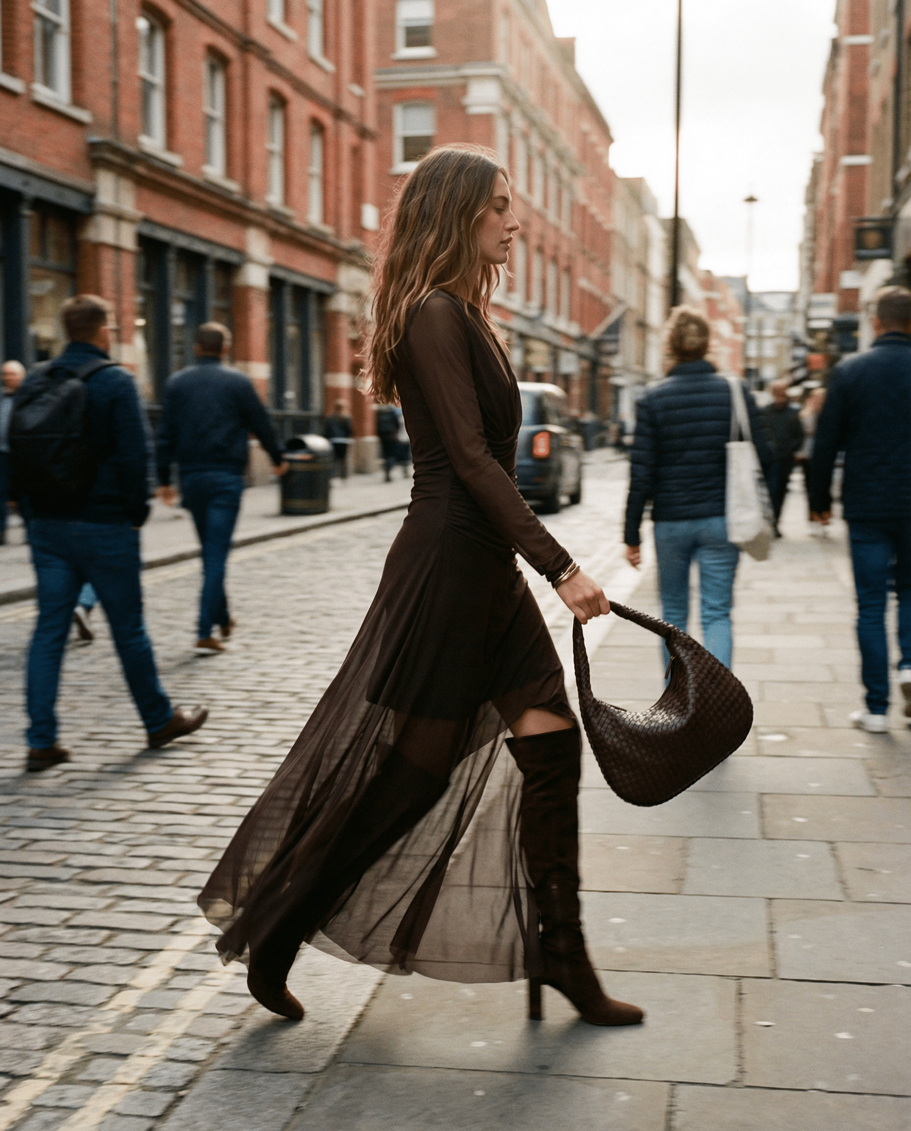 Vestido marrón chocolate confeccionado en gasa elástica con delicadas transparencias y efecto drapeado que realza la silueta. Una pieza sofisticada y fluida, ideal para ocasiones especiales.