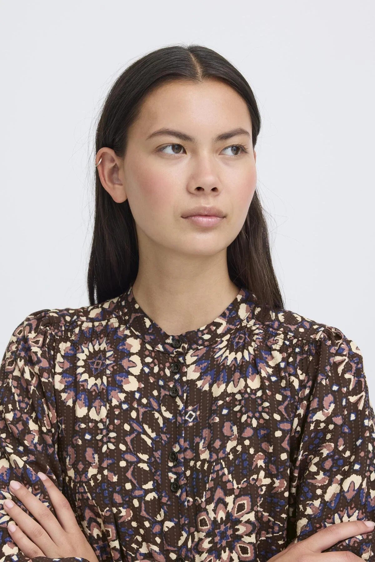 Confeccionado en tejido de raya seersucker con estampado caleidoscópico en tonos marrón chocolate, beige y azul marino.